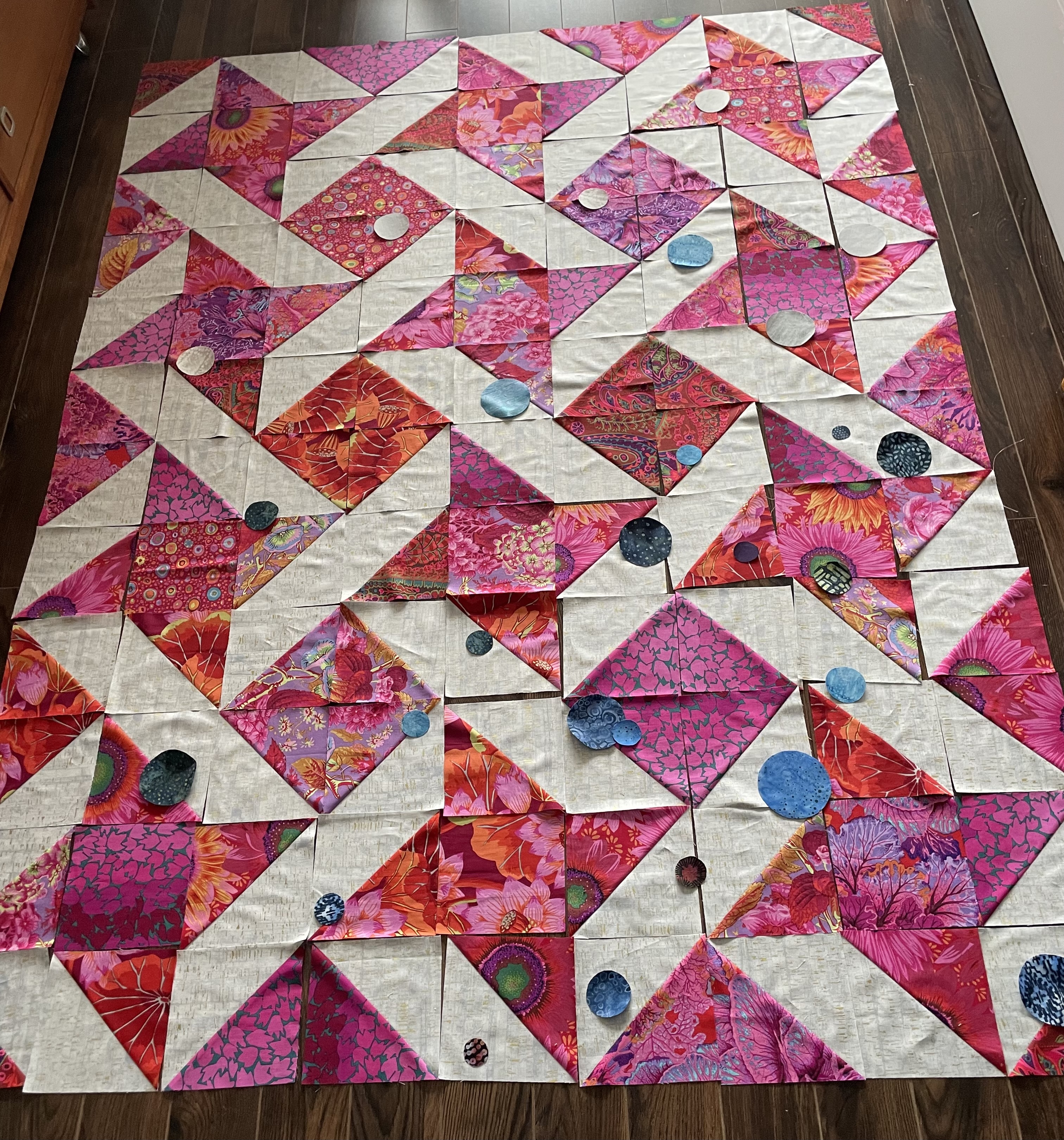 I’ve opted for maximum symmetry in this layout – at the same time doing my best to distribute the star centres as well as making sure all six fabrics are represented in the assembled on-point blocks with a decent distribution of fabrics on the periphery! That’s meant a lot of moving individual and sets of HST multiple times. (I just noticed in the photo that the direction of the background print isn’t consistent! You won’t see it but I can. I’ll have to try swapping blocks within each set to correct that!)