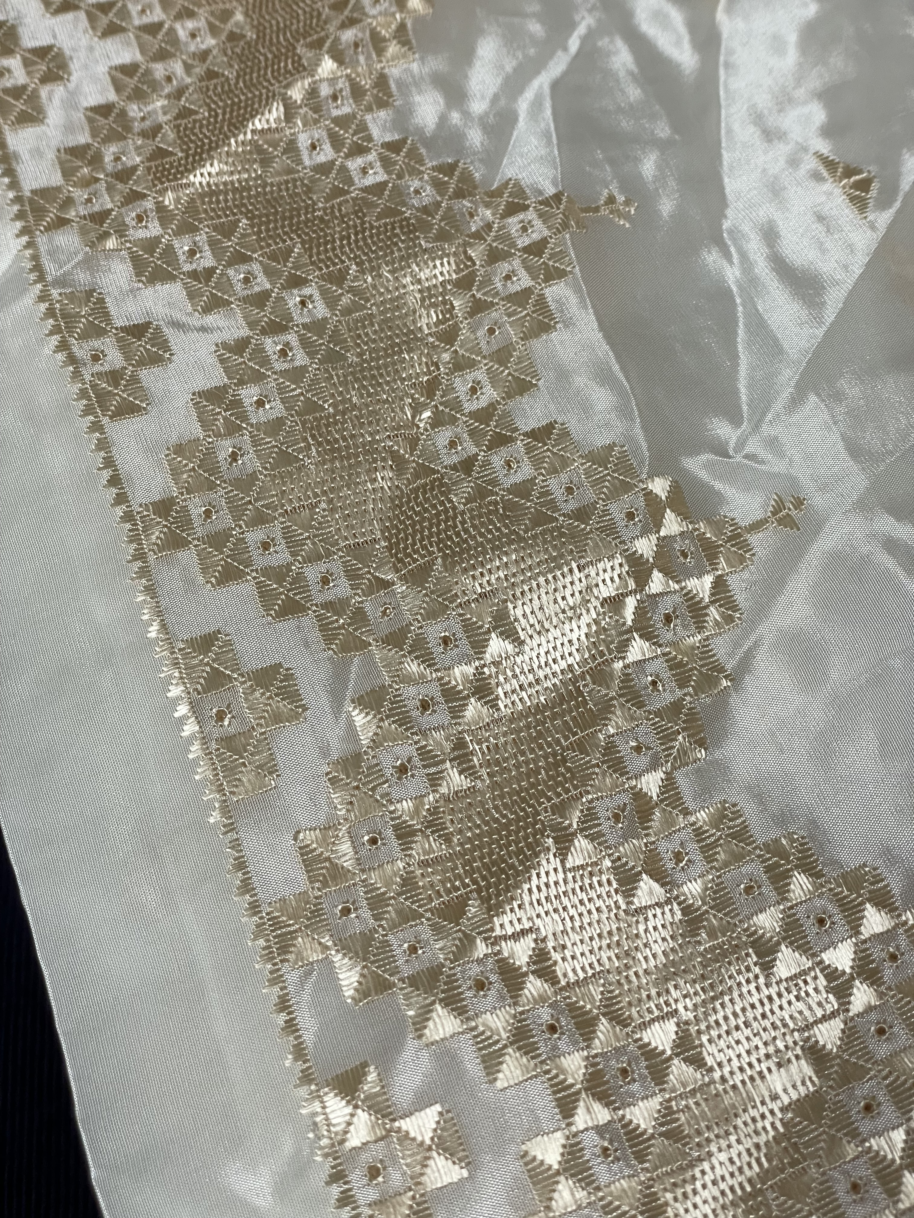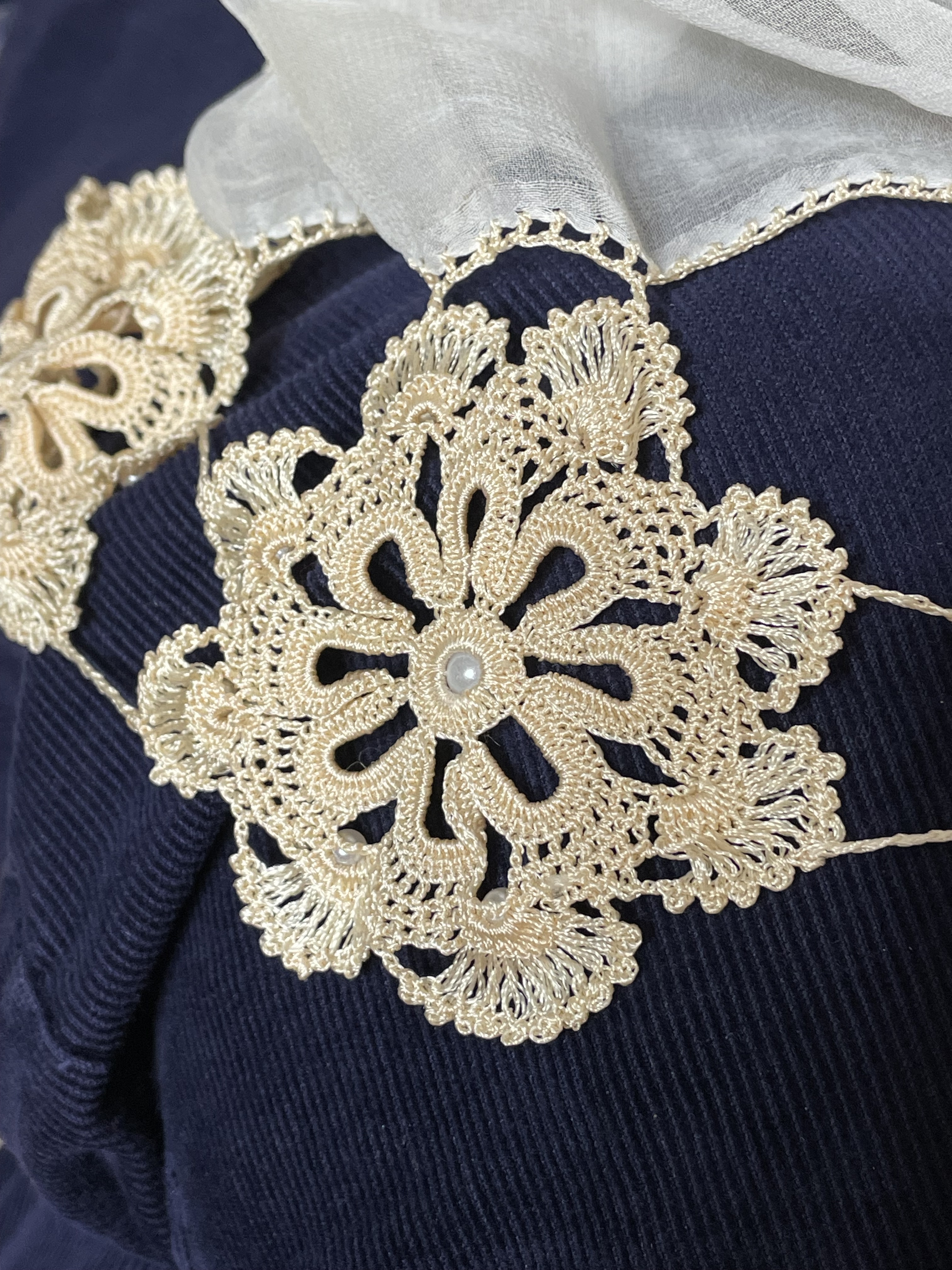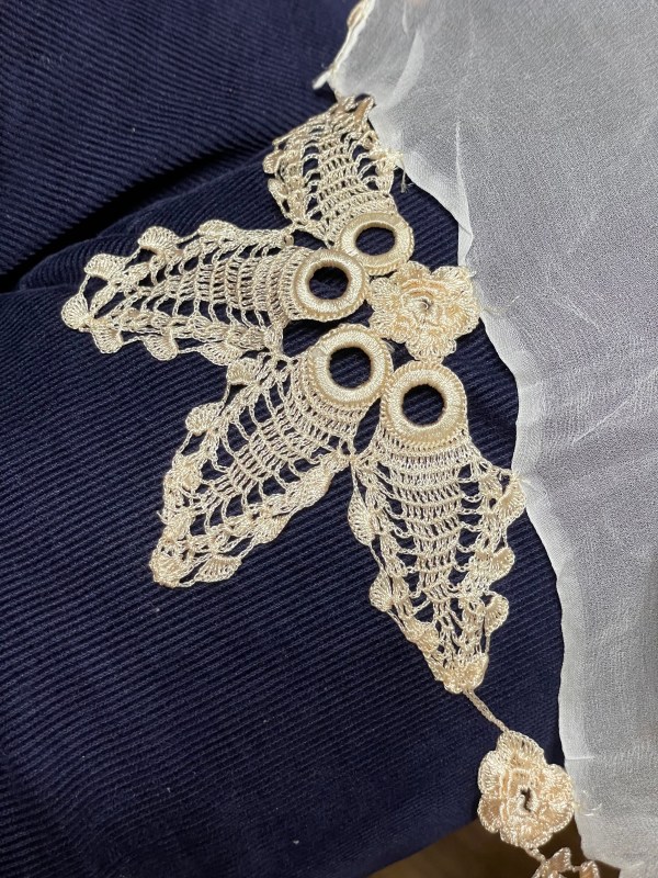 Last night I asked if I could photograph the hand work. What I forgot to do was place a coin on it to show the scale of the work – it’s extremely fine, both the crochet and the embroidery. Incredible precision! Not a hope in hell I’d be able to work with such fine thread (crochet or embroidery) and control it as magnificently as this work. The fabric is also a very fine, closely woven, either a lightweight cotton or a silk. It’s breathtaking!
