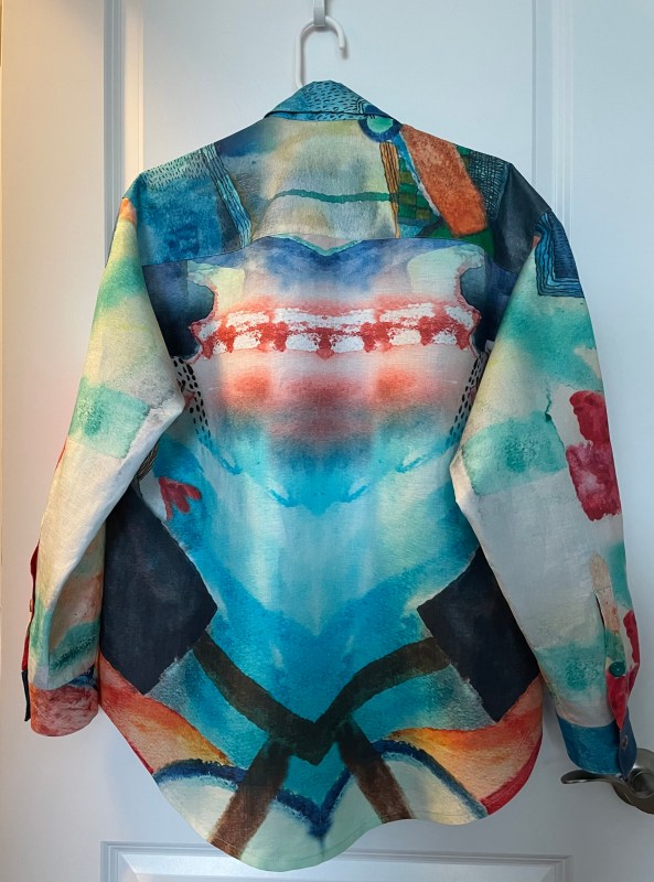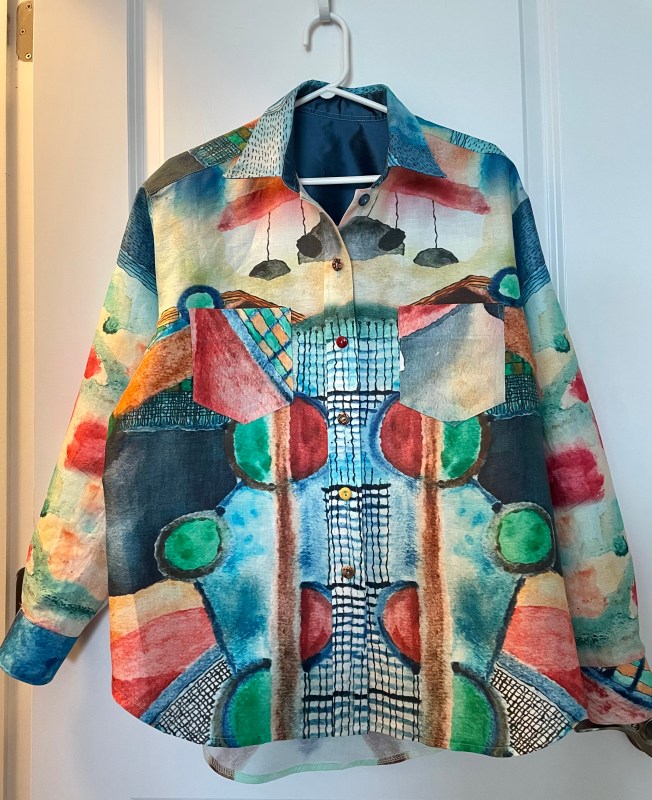 I started this garment last weekend. I worked on it during the week; today I added the sleeves (I’d already put the sleeve plackets in using Pam Erny’s 2-piece placket), serged the seams, top stitched them, sewed the sleeve/side seams, serged those seams, serged the bottom edge and stitched up the hem; made buttonholes, and machine sewed the buttons!