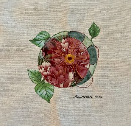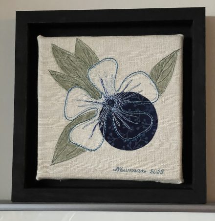 This version is closer to what I see in my minds-eye. The silk background fabric gives an overall subtle texture to the piece. The dark, small patterned fabric sets up a background, the flower outline is a good contrast and stands out. I used a small fabric circle as background for the embroidered flower centre (using the precise positioning capabilities of my embroidery machine to position the embroidery). I overstitched the flower centre elements to emphasize them. I added some leaf shapes cut from fabric scraps backed with fusible web (glue) although I haven’t yet stitched them, I will do that tomorrow. I also tried out the position of the signature which is a bit too large. I have to scale that back a bit.