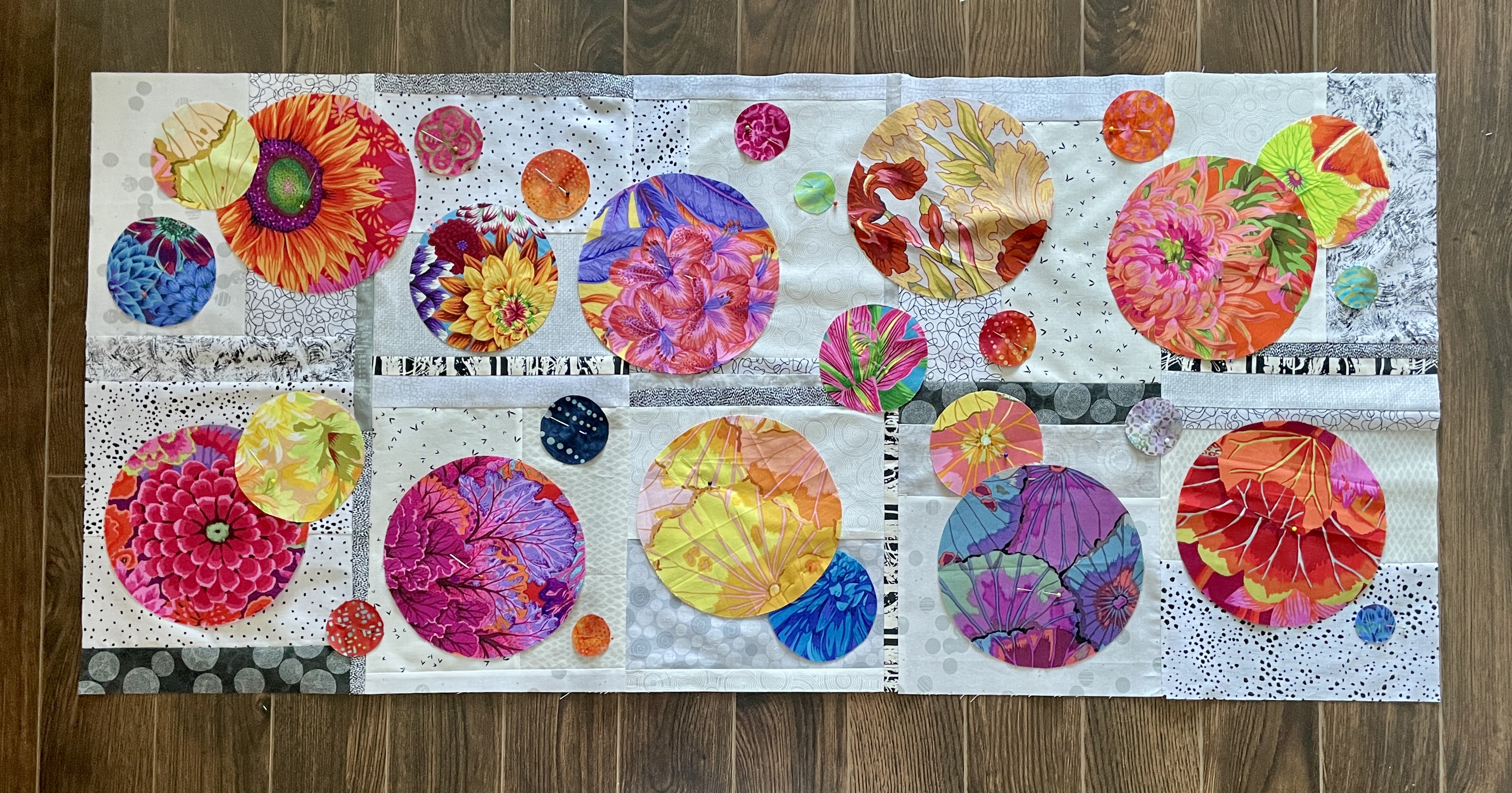 The circles are pinned in place for the moment – looking at the photo I can see I want to move them about some more. I’ve also decided the whole thing will be an appliqué work – I’m not going to fight to insert the large circles into the background! So I’m moving along.