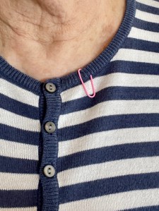 I just found a small pink paper clip in my stash of “office” stuff. I intend wearing it (I’ll see if I can find a large pink one at Dollarama!).