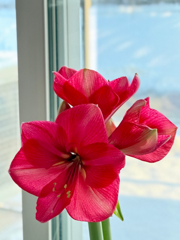 This was my Amaryllis yesterday – three blooms opening, with three more coming on that one stalk, and six more on a second stalk!