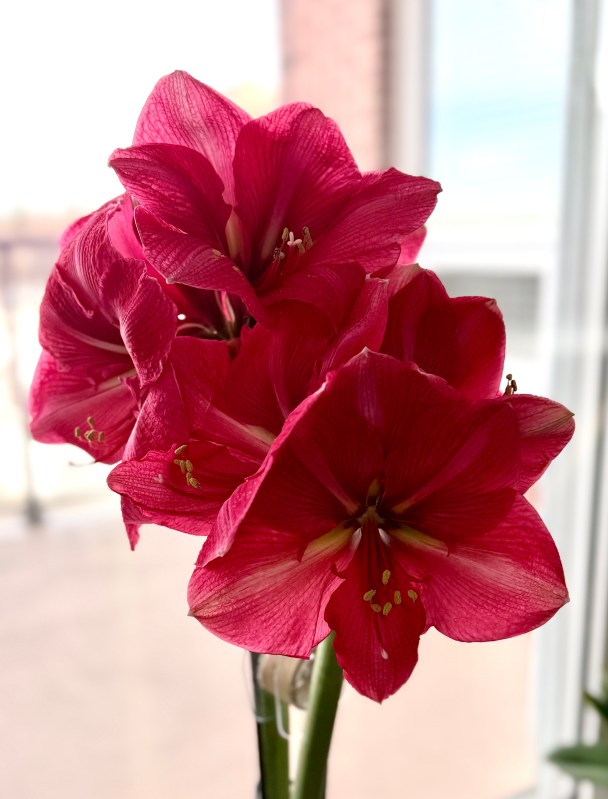 I think I count 9 flowers on my Amaryllis today – both stalks are almost in full bloom. Each stalk has 6 flower buds, I don’t think I will see all six on both stalks open at the same time, but it sure is close today!