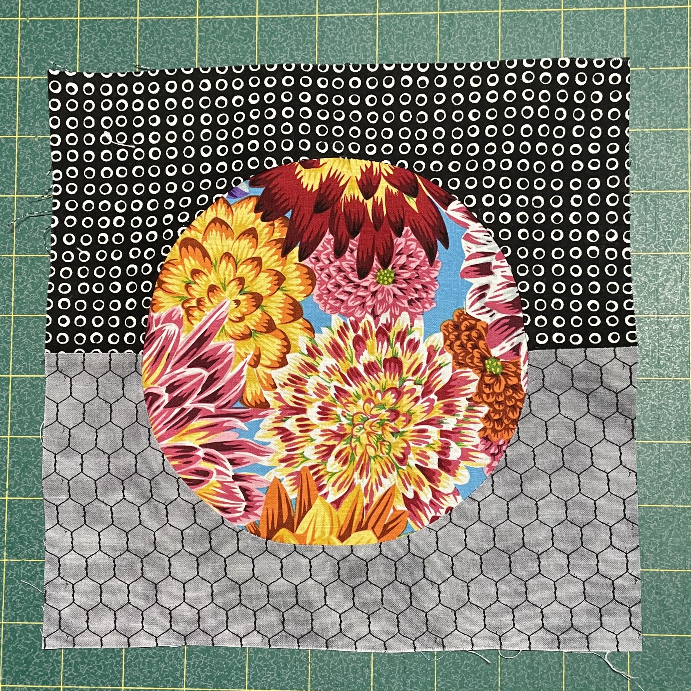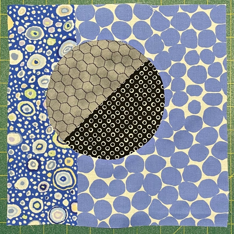 I was surprised by the lack of circularity – it’s not a problem I’ve encountered before but it happened this time because I’d cut my pieces large, intending to trim them, and that affected the curvature of the seam. I lost the full arc where the four blocks would have joined after I trimmed the finished blocks. As I continued, I trimmed the pieces before stitching them together, consequently my later blocks today are more obviously circular. That purple “circle” at the bottom is definitely going to bother me – I have enough fabric to redo those 4 blocks.
