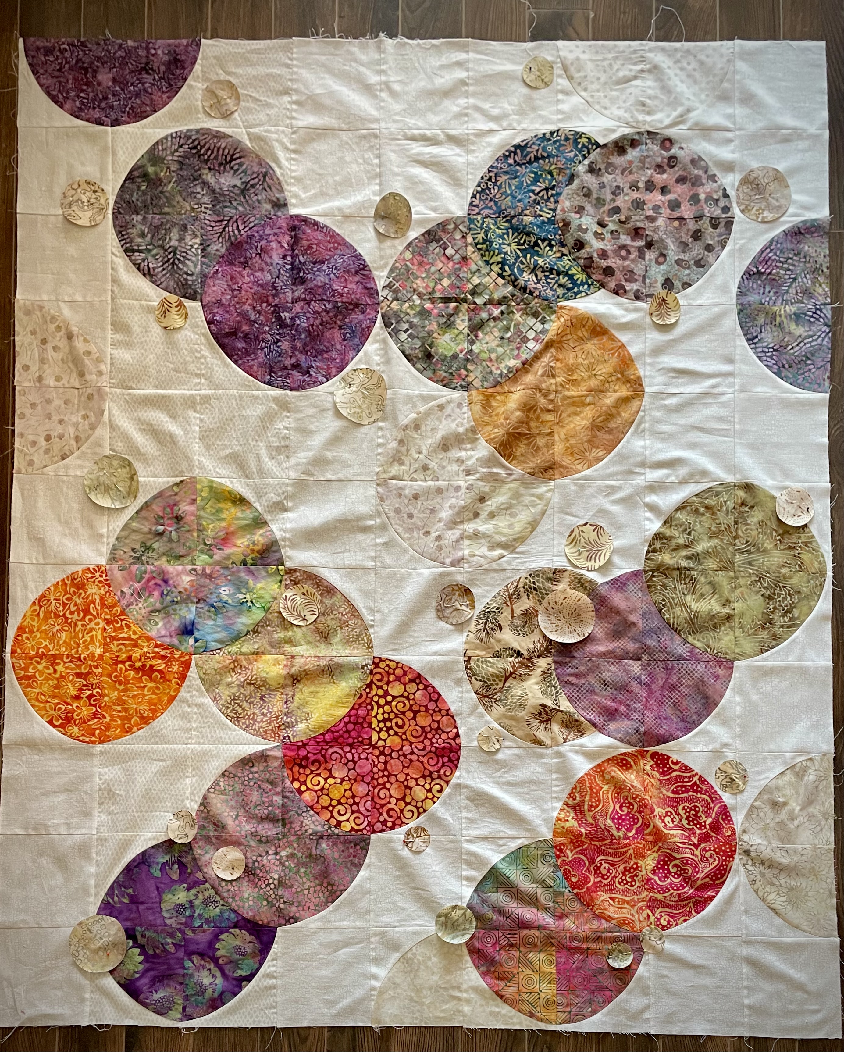 I started working on this new quilt three/four weeks ago – I came across a photo of minimalist square quilt of overlapping circles against a light background with a lot of open background. The image appealed to me so I drafted a rectangular version on graph paper, pulled a bunch of contrasting batik fabrics from my stash, numbered them, then distributed the numbers on the circle elements in my diagram. I counted the number of solid blocks, the number of drunkard’s path blocks using the background, the number of drunkard’s path where two circles/fabrics overlapped.