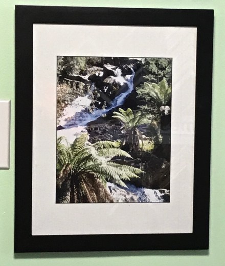 The other day I was at the physiotherapist – I was at one end of the room and this photo at the other end caught my eye – at the distance a face popped out – two eyes, the left cheekbone, mouth, the suggestion of a blue hat. It’s actually a photo of a waterfall but for me – it’s a face!