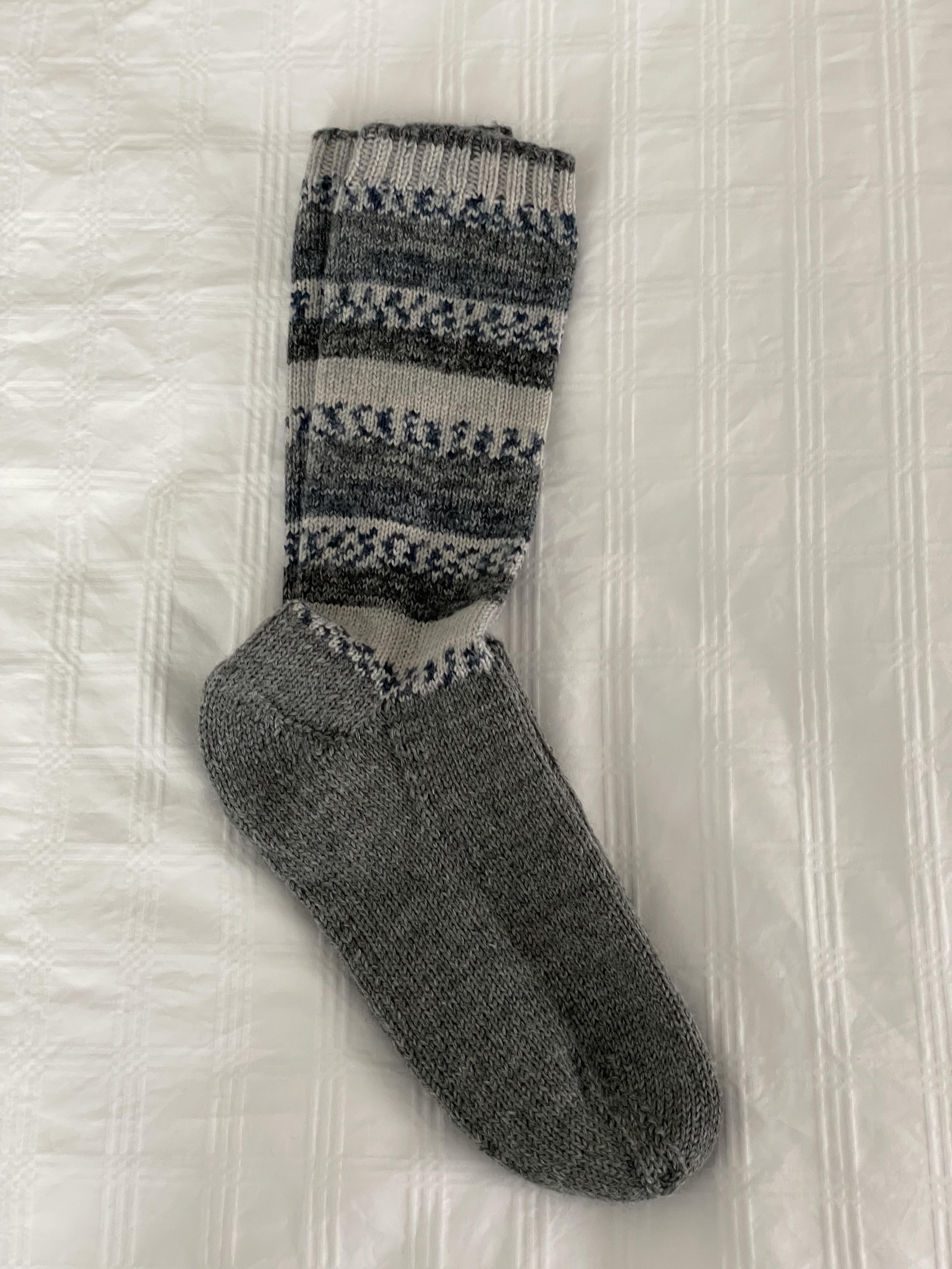 The thing about salvaging legs is that at least half the job is done – it’s just a matter of knitting new heels, foot and toe. I picked up the stitches at the open end of the leg and got to work. I was about half way through reknitting the foot of the second sock when I realized I probably would have ended up with a more interesting sock had I done the foot in navy blue to pick up the accent colour in the leg – but grey socks these are.
