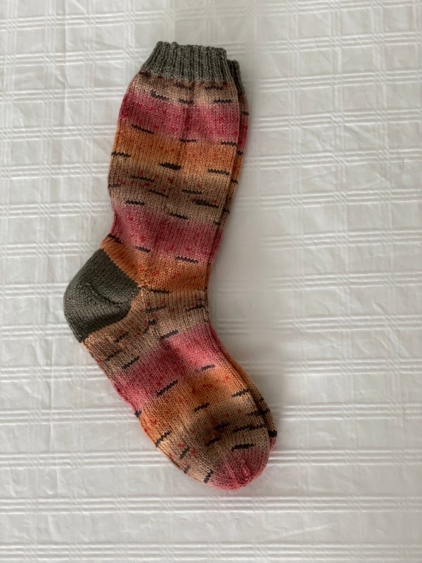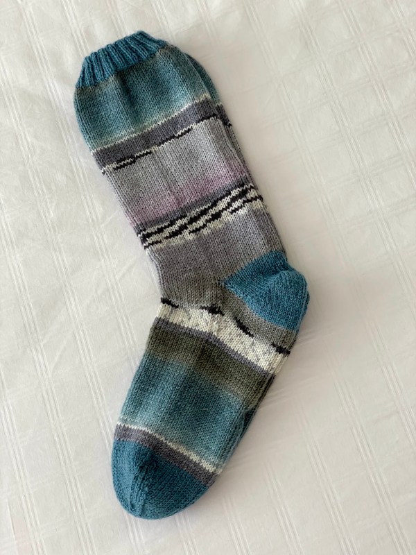I finished this pair last evening after having done absolutely NO knitting for six days. I came down with a norovirus a week ago – vomiting, diarrhea – which lasted four days and then I was too lethargic to do anything but binge watch a TV series on Britbox – Waking The Dead. I finally picked up the sock again (the second sock just needed a toe), finished it, then put stitches on for a new pair.