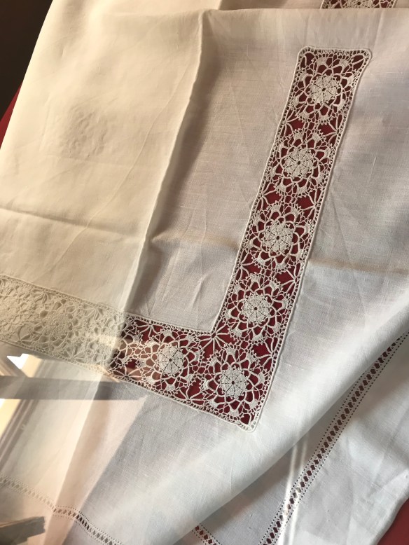 Here you can see the problem – the heel flap is solid (the sock in behind and below the needle) but the heel turning and the instep are both weakened and worn through. I could cut out the entire heel and reknit the instep but that’s more work than the restoration warrants so I’ll do what I did with the previous pair: I’ll reinforce the weakened spots in the instep by oversewing the existing instep stitches, then salvage the heel flap and reknit the heel turning. Otherwise these socks are in good shape; worth refurbishing and keeping in a sock drawer.