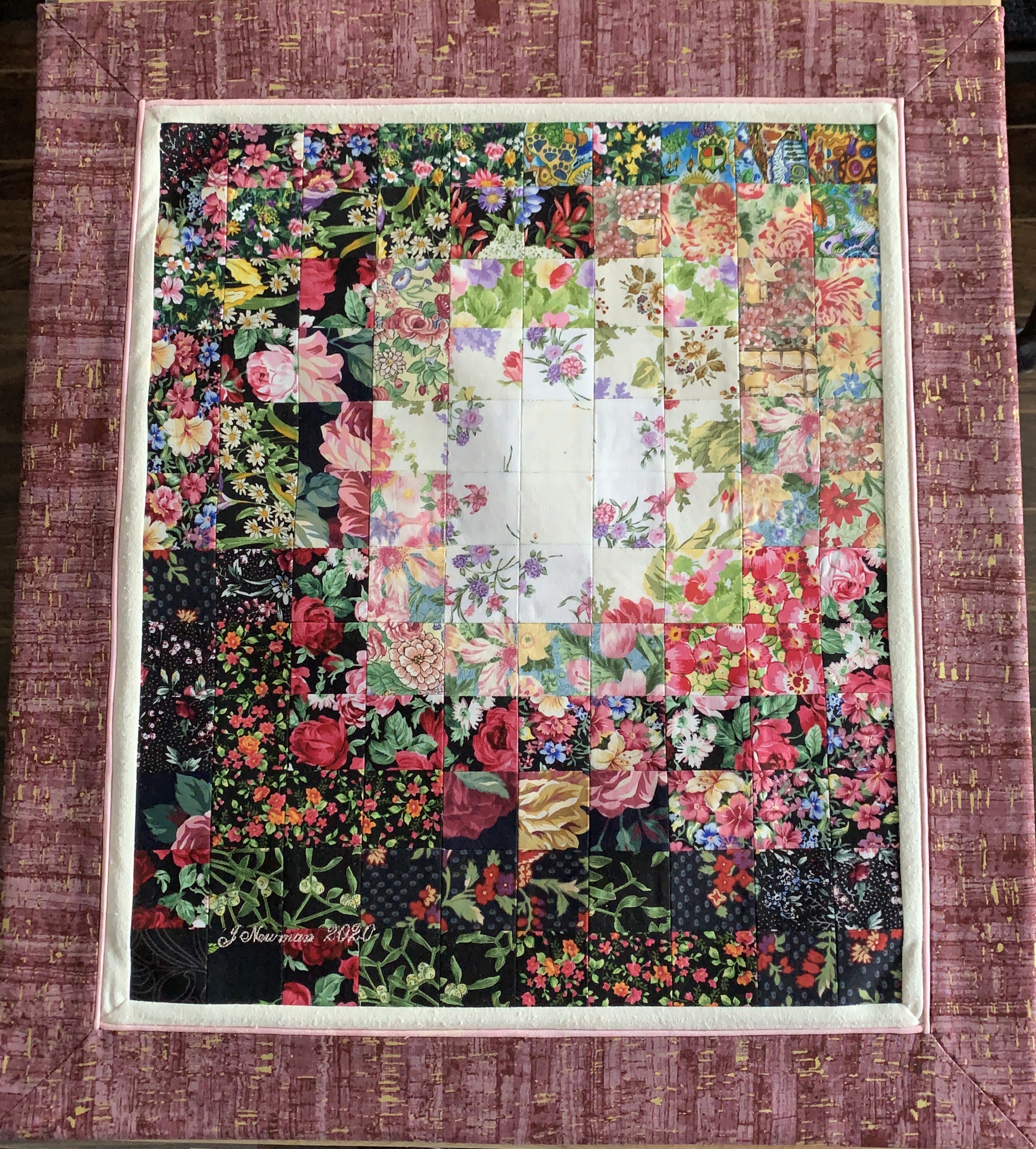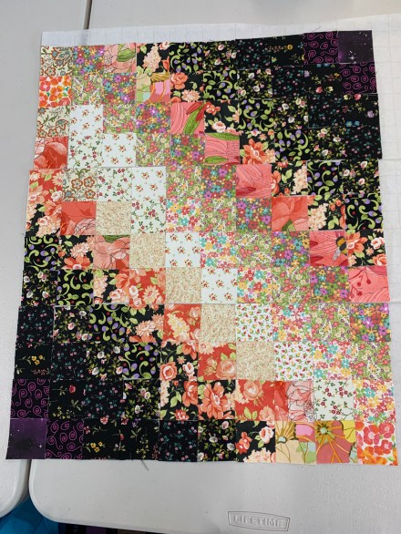 That was as far as we got on Wednesday. Homework: to stitch the panel completely – first, sew the rows together, then the columns, with the 1/4″ seams pressed open (to allow the panel to press flat).