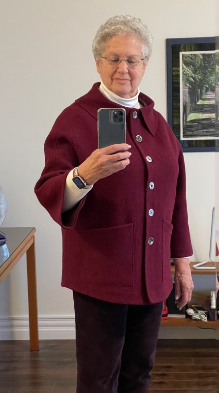 The jacket is a good length on her. I like how it drapes in the front and hangs straight in the back. The “boat-neck” sits solidly on her shoulders although it’s too open to wear without a scarf. I scoured my scarf collection and decided a navy print mobius scarf I made several years ago would fill in the neck nicely.