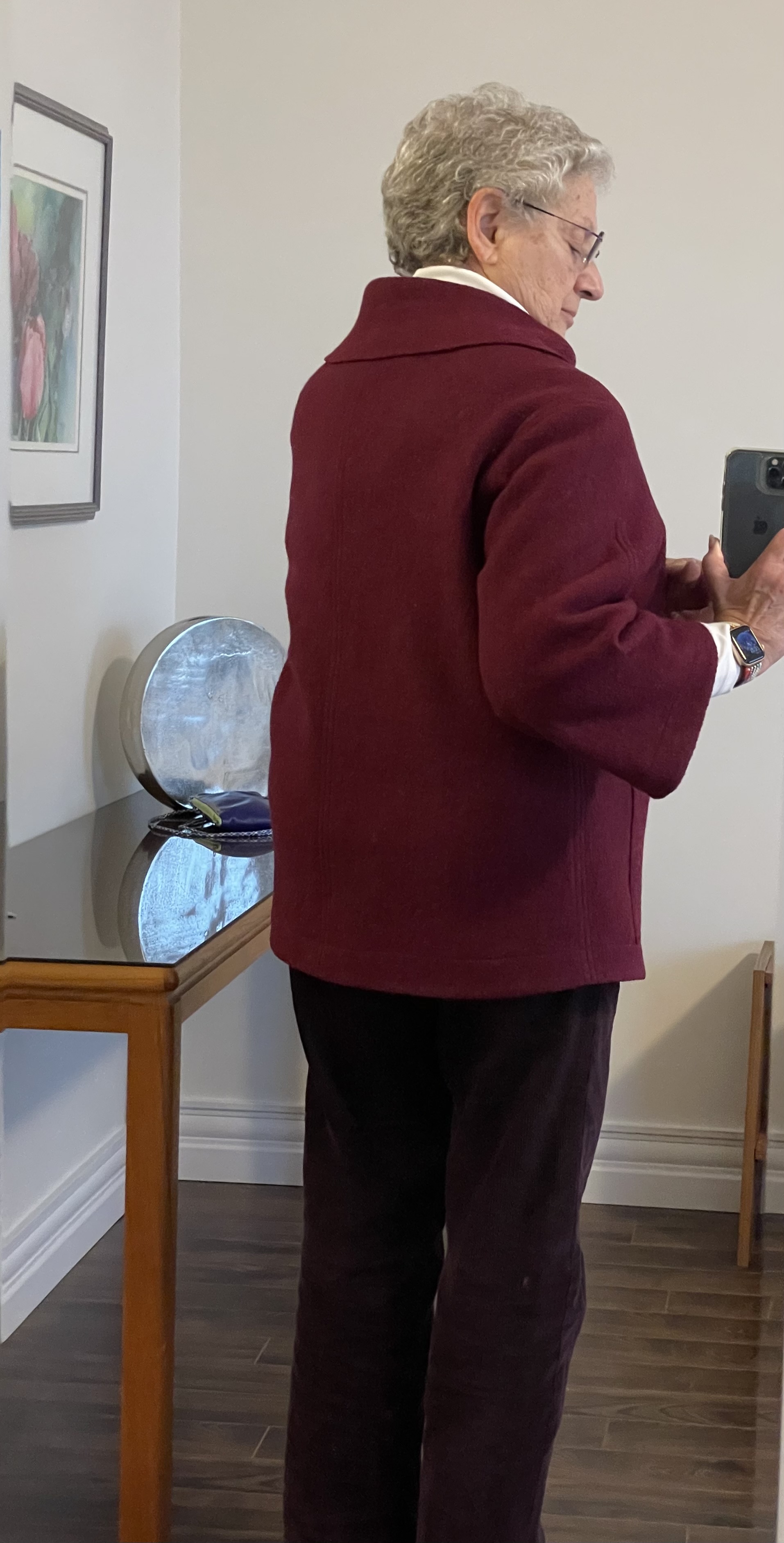 The jacket is a good length on her. I like how it drapes in the front and hangs straight in the back. The “boat-neck” sits solidly on her shoulders although it’s too open to wear without a scarf. I scoured my scarf collection and decided a navy print mobius scarf I made several years ago would fill in the neck nicely.
