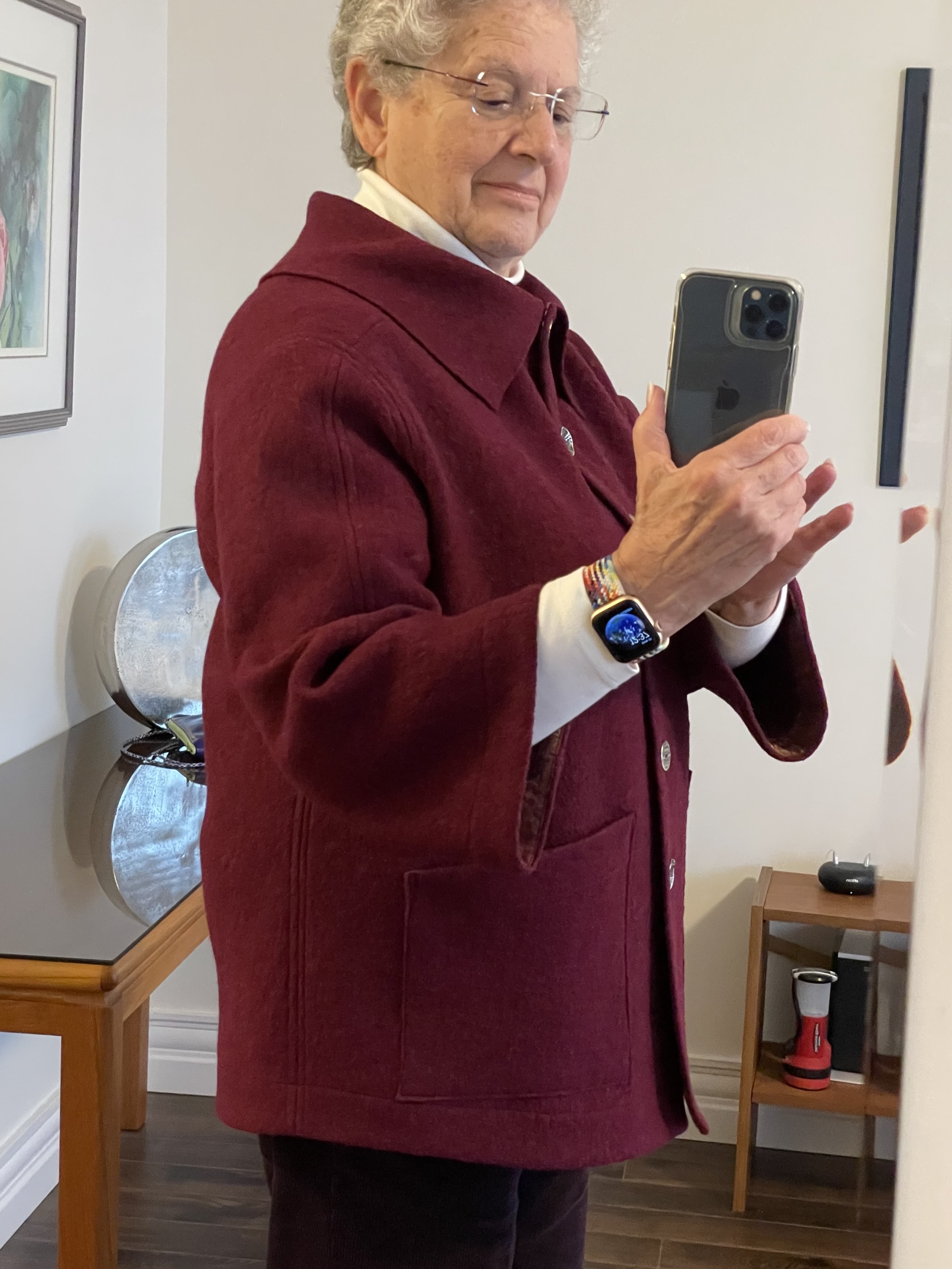 Ruby expressed interest in having a boiled wool jacket when she saw mine. So we went shopping and I talked her into this pink poly/wool blend boiled wool fabric – heavier than the 100% wool I’d used but likely warmer.