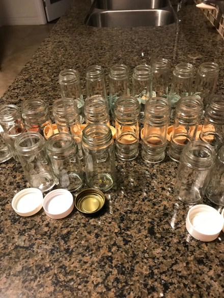 I started by lining the pans with parchment (holding it in place with wooden clothes pins until the batter was added and smoothed). I measured out the dry ingredients, then the wet – both need large mixing bowls to hold the quantity I make.