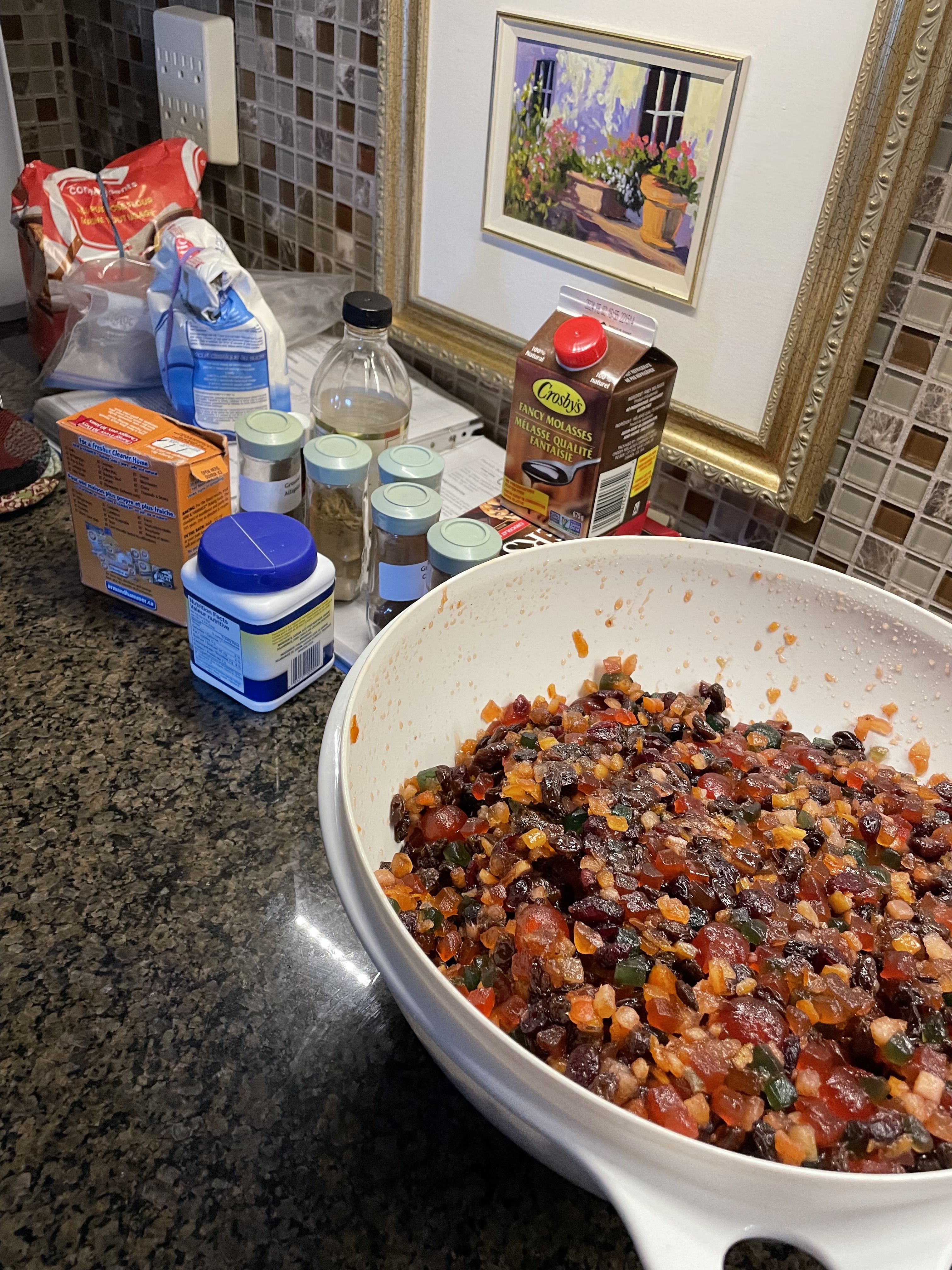Last week I bought the candied fruit, raisins, dried cranberries, dates, orange marmalade, a bottle of dark rum (the cost of everything had increased but I’m not complaining – I paid the bill and carried on).