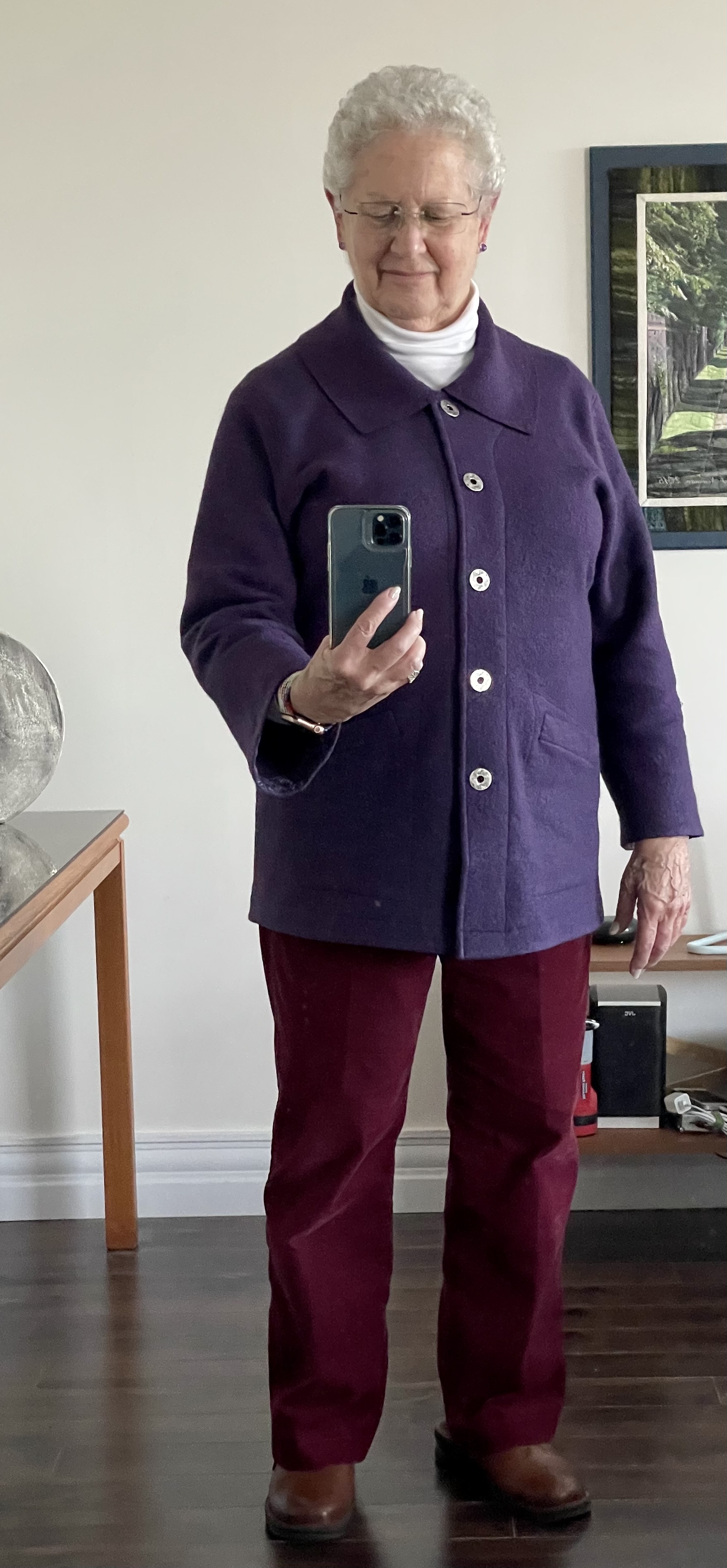 The jacket looks a bit wrinkled because I’ve been wearing it all day! It’s warm and cozy – just what I was hoping it would be. (And the two front edges are the same length, yeah!)