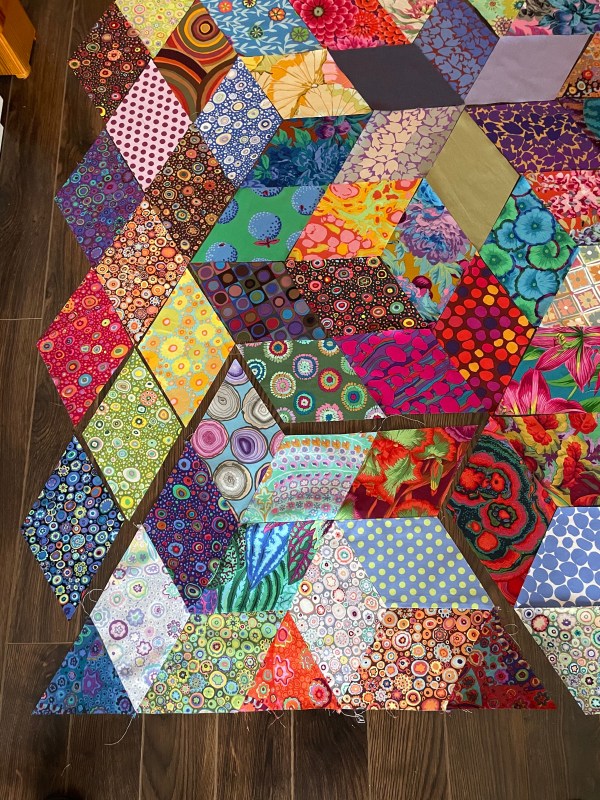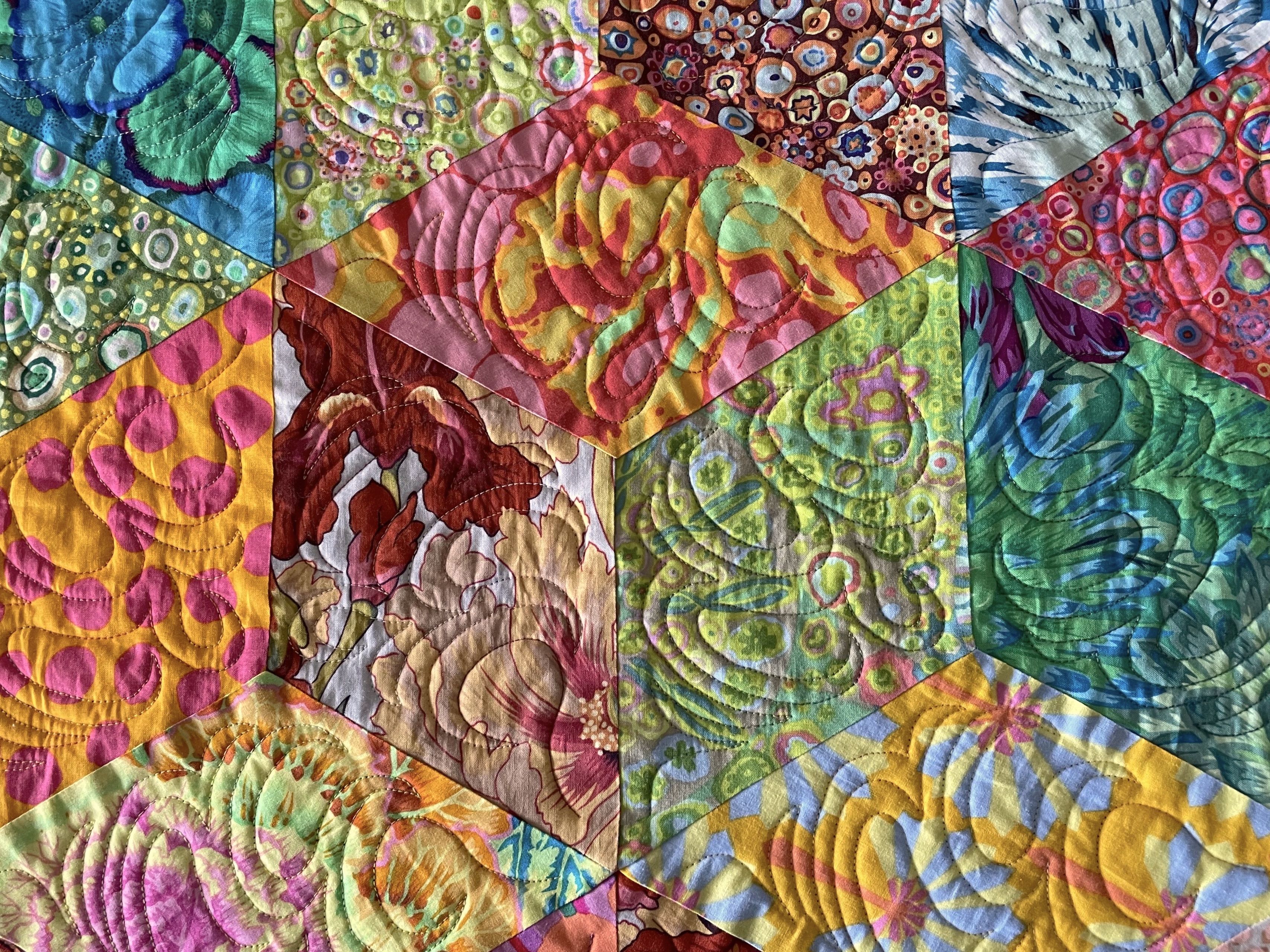 Finished the quilt yesterday – at least for the moment I’m considering the quilt done. I’m still contemplating quilting the seams in the ditch but pressing has flattened the 6-point joins reasonably well – I may leave well enough alone.