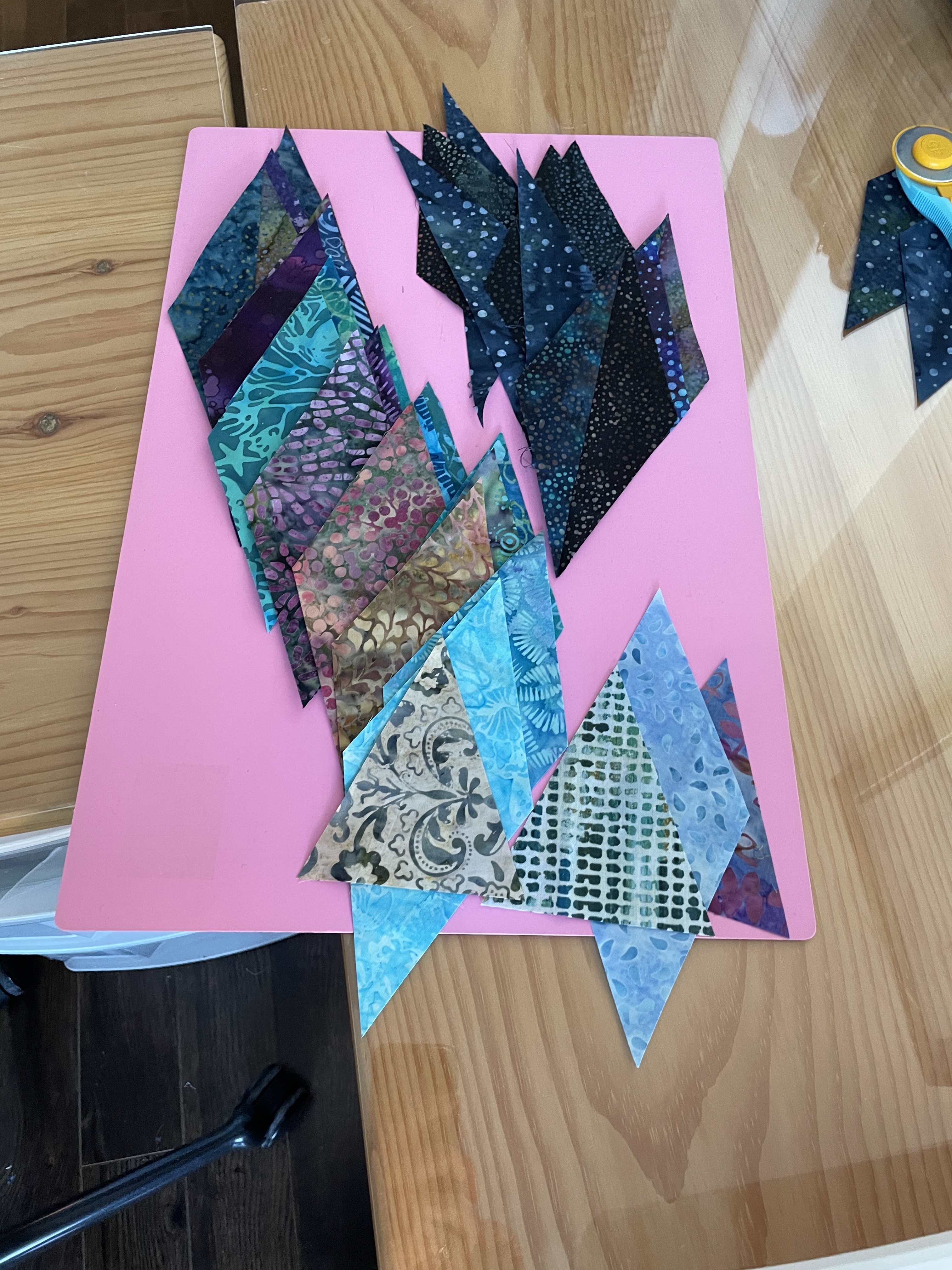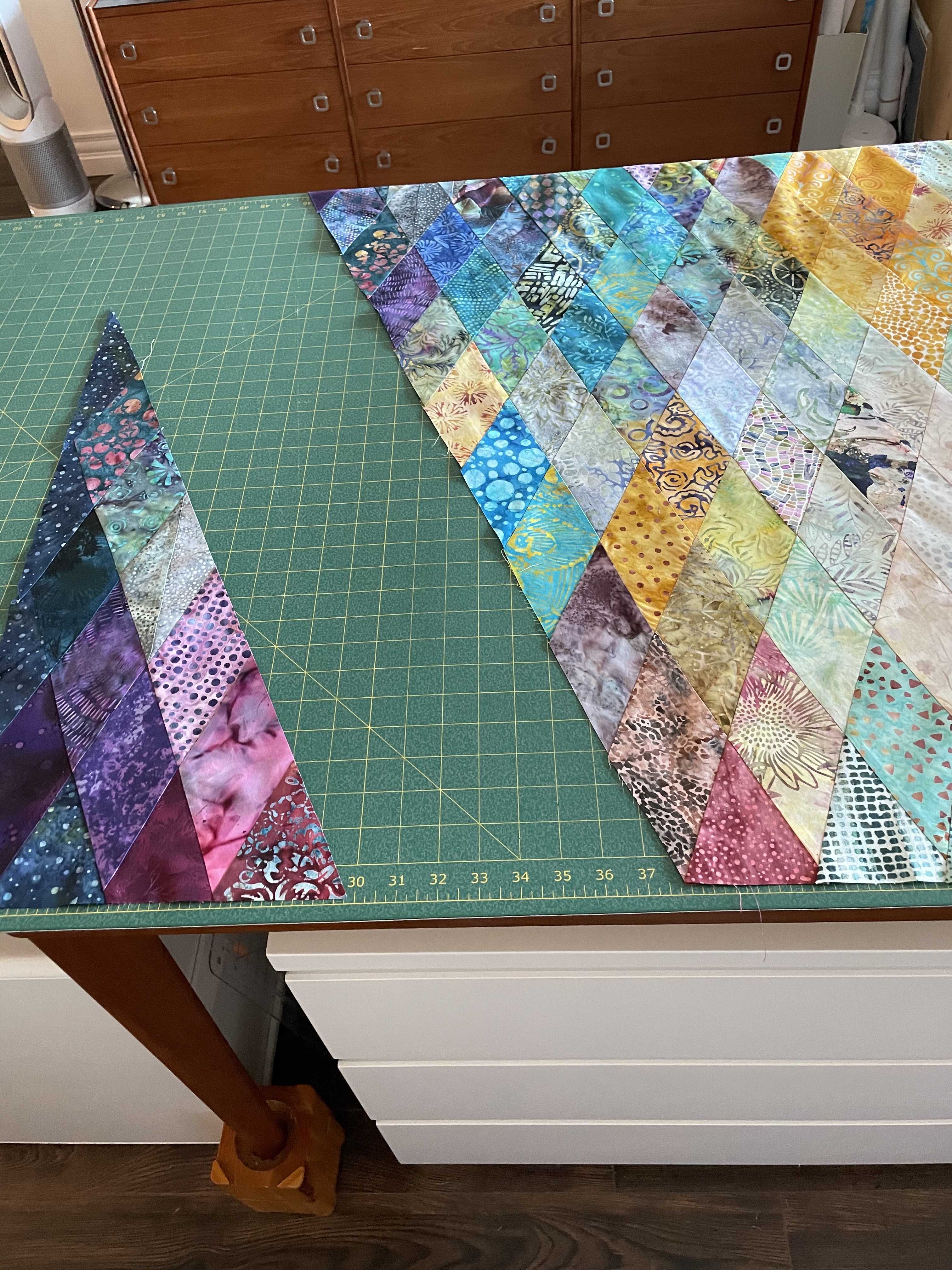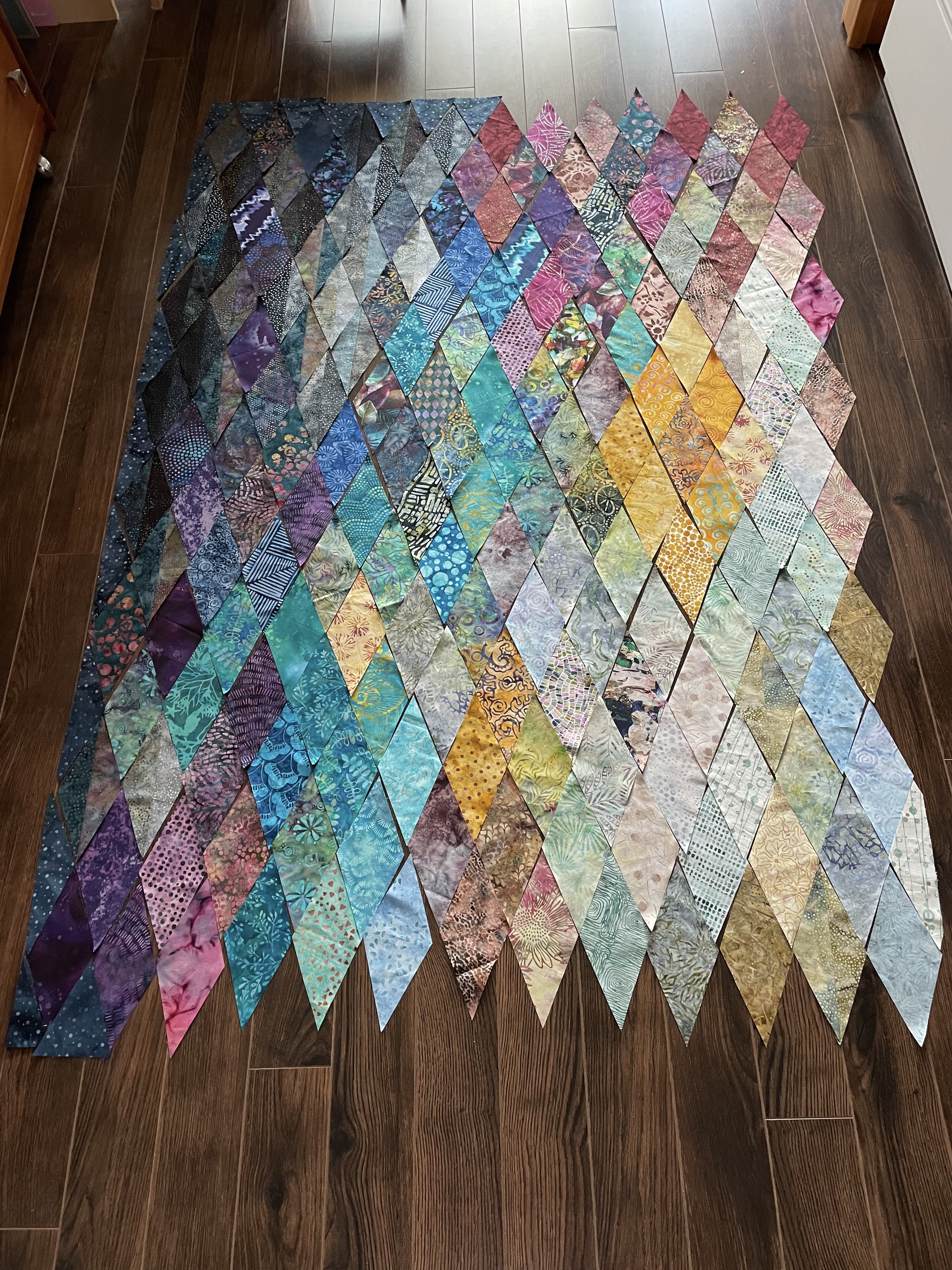 Oh, and BTW, I cut 76 diamonds from the leftover 5 1/4″ strips (along with 45 triangles), colour sorted each pile, and put both aside. I try working on just one project at a time so I can actually finish it.