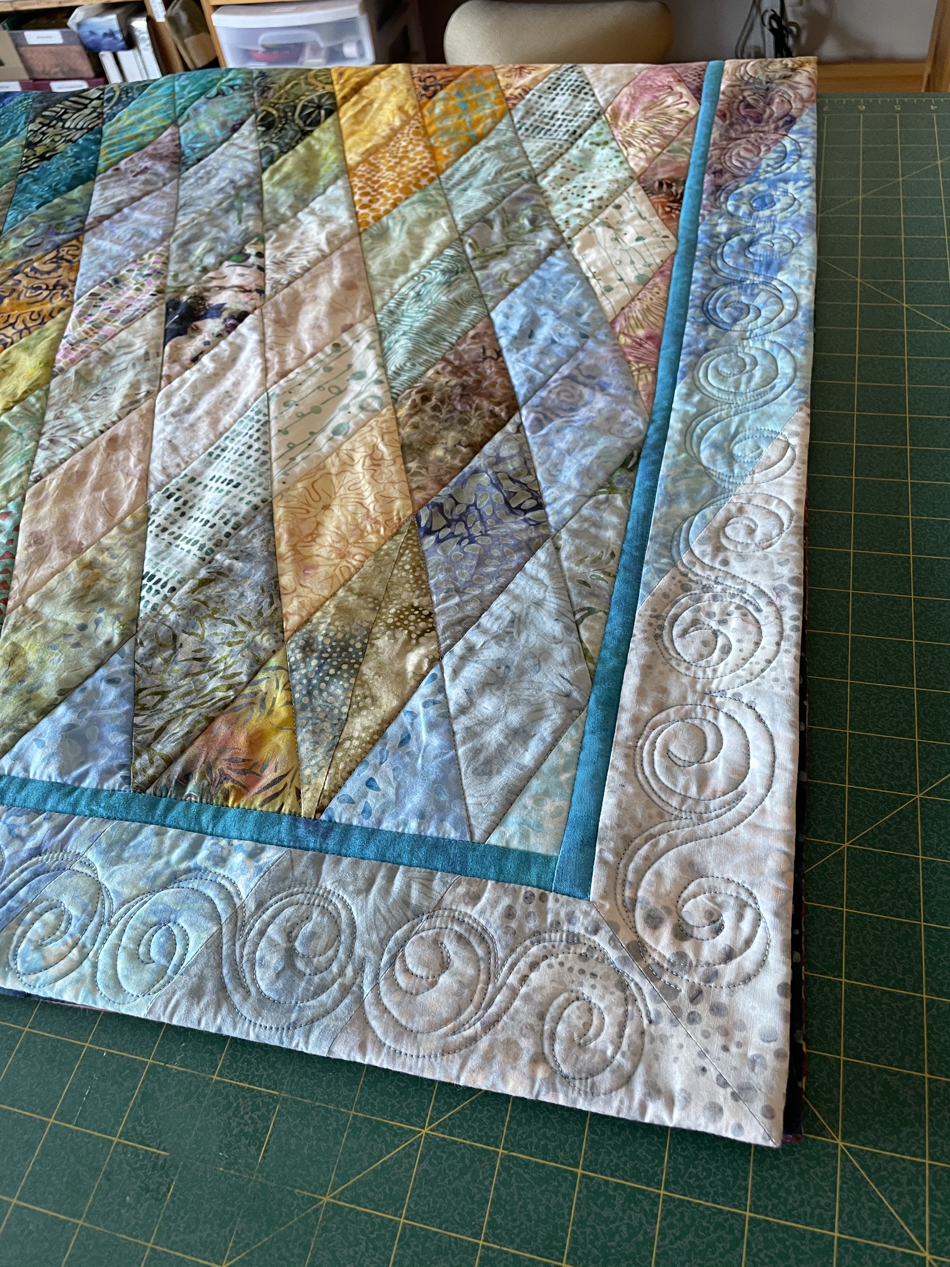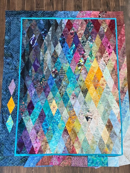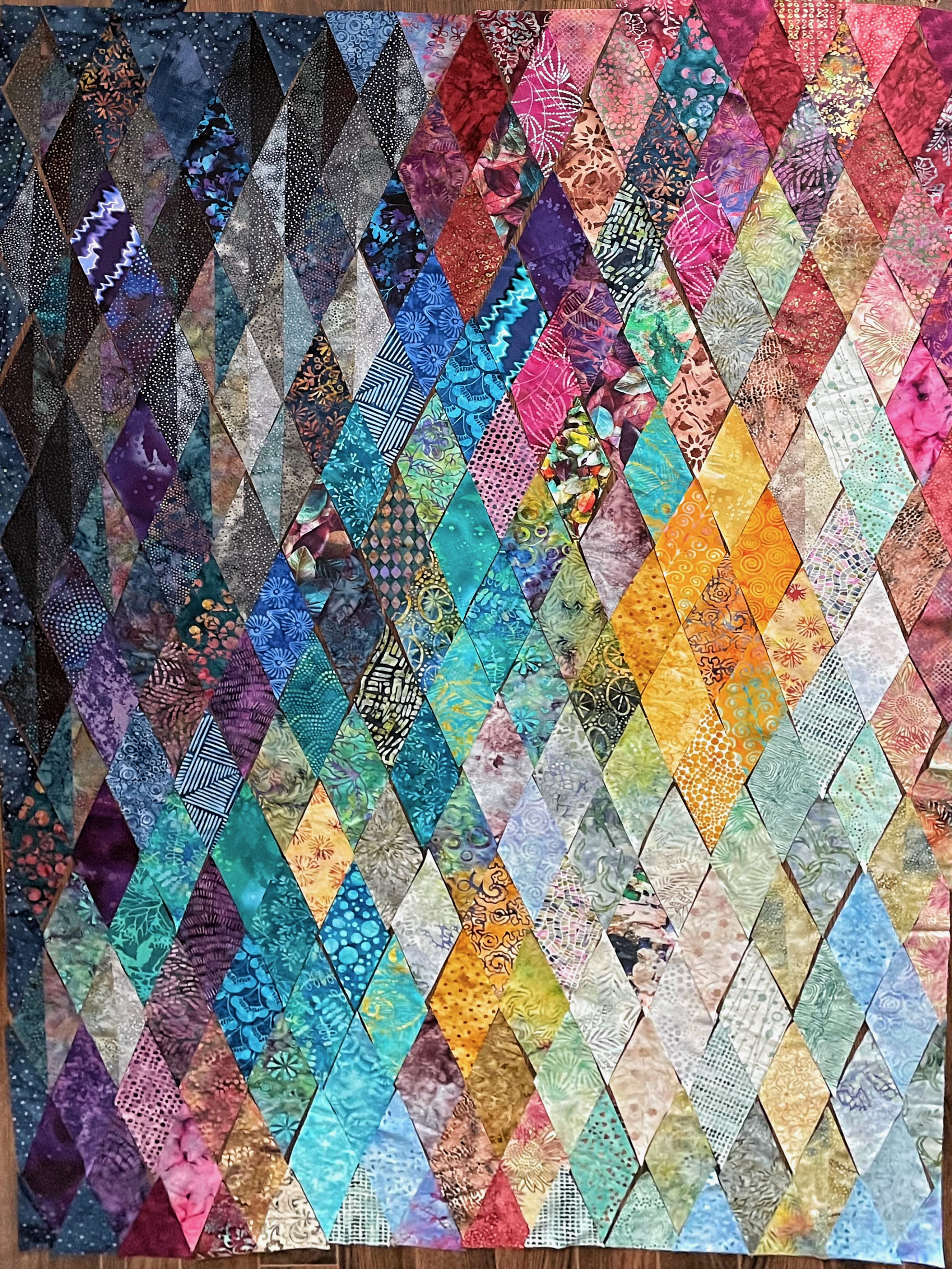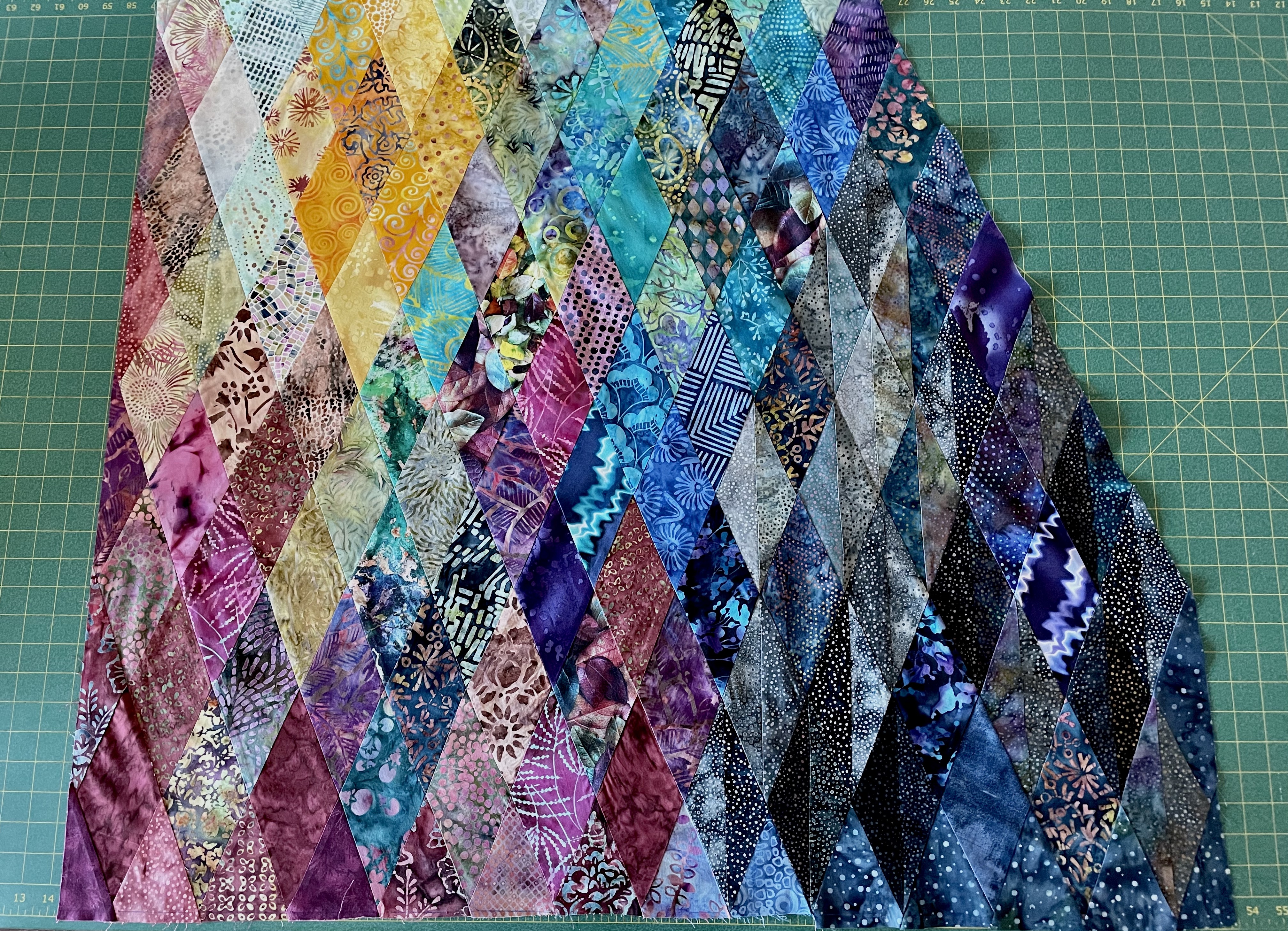 Oh, and BTW, I cut 76 diamonds from the leftover 5 1/4″ strips (along with 45 triangles), colour sorted each pile, and put both aside. I try working on just one project at a time so I can actually finish it.