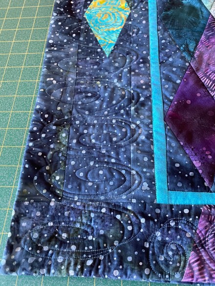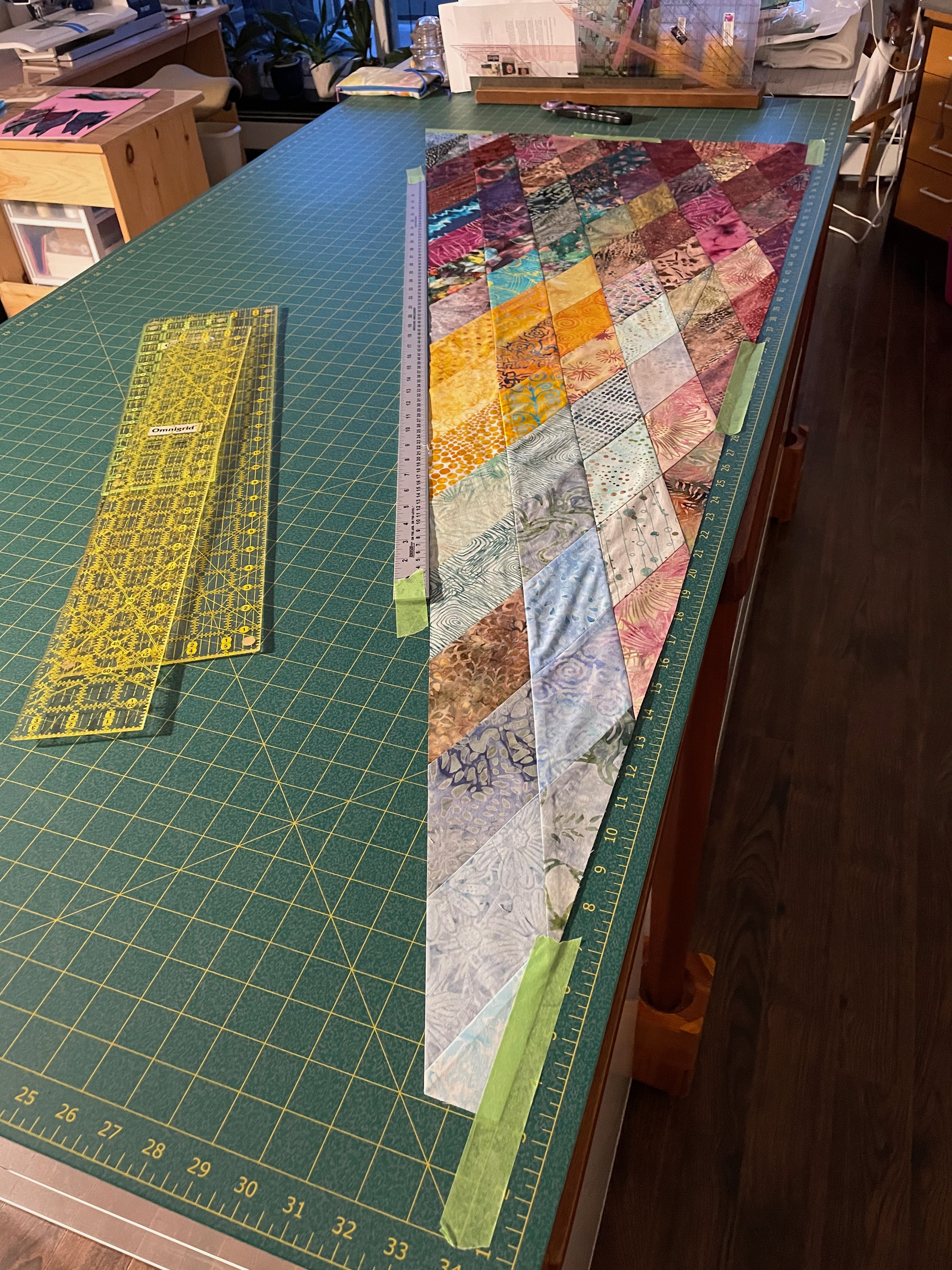 My 1/4″ eye is actually pretty good – I have marked some of the “dot” positions in what I’ve assembled so far, but I think I can do reasonably well by aligning a pin in the precise location I want to start sewing and finish sewing – I’ll see as I go along. The difficulty with marking dots on each diamond is that I don’t have a 60° diamond template with small holes in the corner start/stop seam allowance positions so I’m having to improvise using a ruler which is very cumbersome and time consuming.