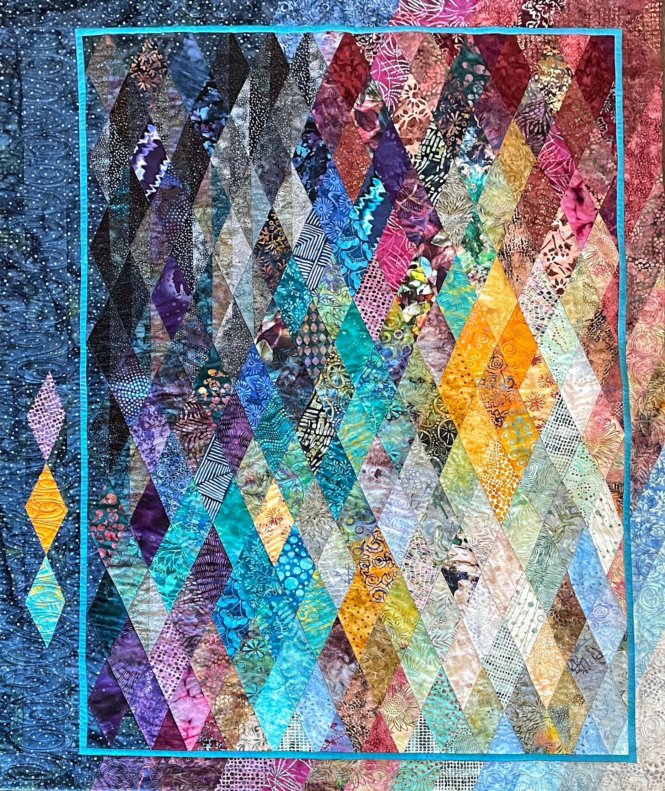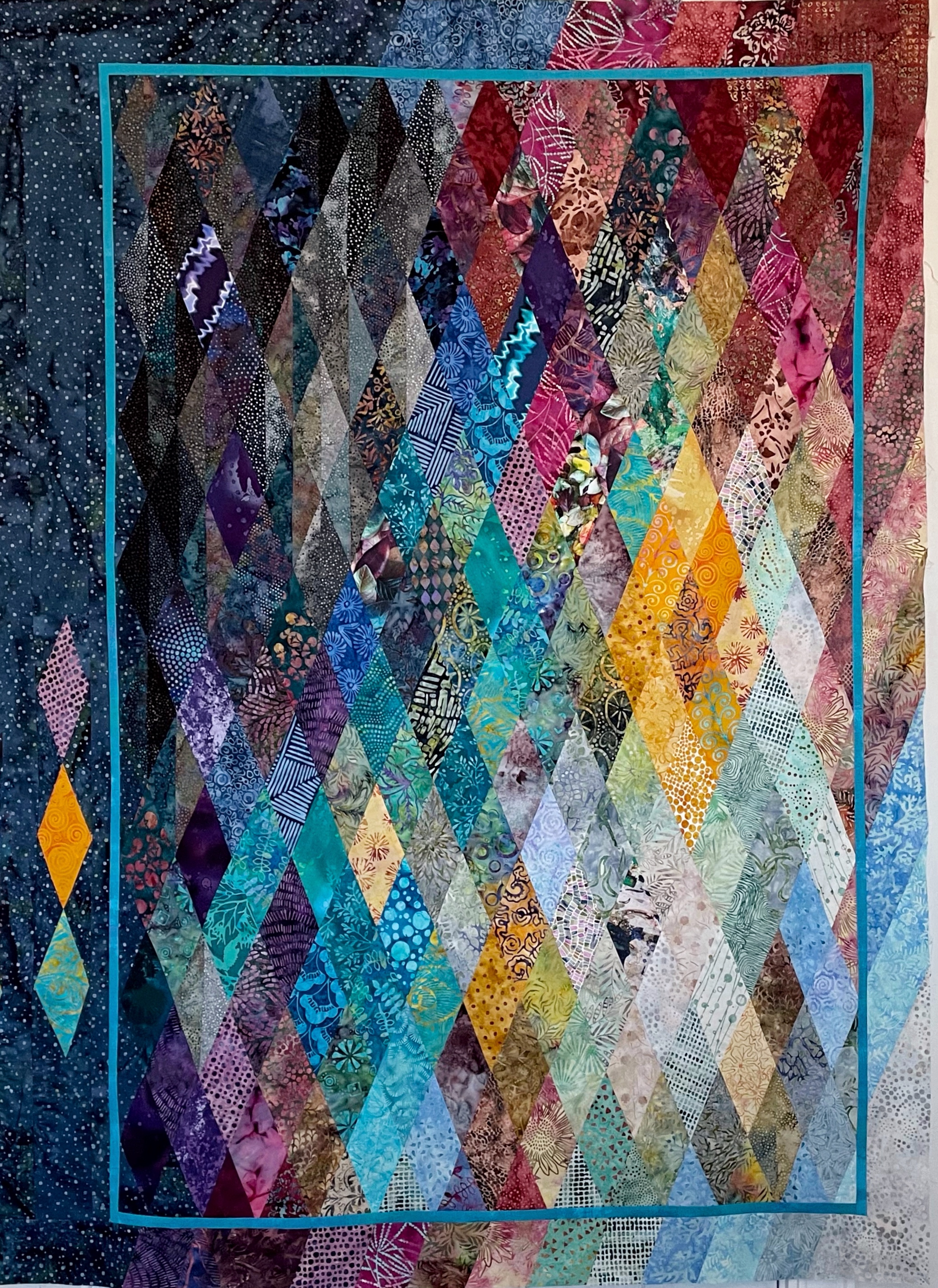 I did a bit of research to find out how to put this collection of diamonds together. The objective is to assemble the various hexagons where they occur (the cubes) using a Y-seam to add the third element; then joining diamonds in the usual way with the 1/4″ overlap.