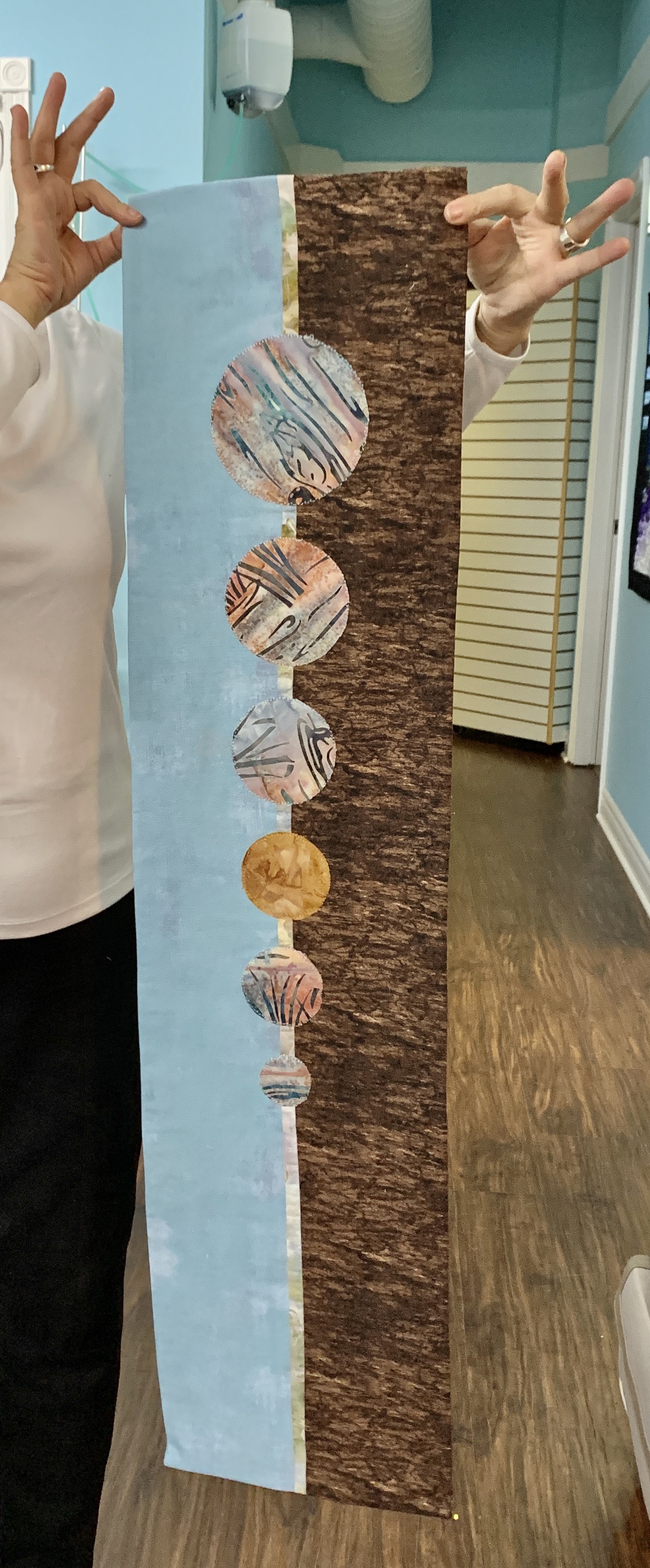 To prepare for the class, I set up four skinny quilts as examples. I’d sewn backgrounds using narrowish width of fabric cuts from complementary fabrics and then cut out and arranged on each some shapes (to which I’d already added fusible web).