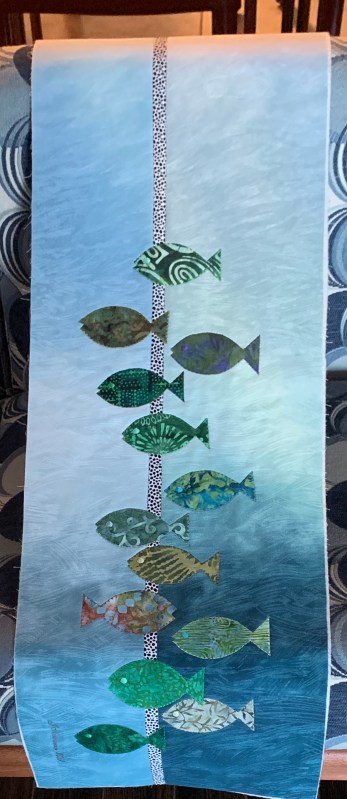 The fish were leftover pieces I’d saved from the just finished quilt. As I was cutting out the “X” pieces I realized I was creating “Fish” shapes which I saved thinking I’d find a use for them at some point. It turned out the light coloured fabric was short a few inches from a full width of fabric panel so I added in the dark blue piece (also a leftover from the just finished quilt). The school of fish is swimming at the bottom of the panel.