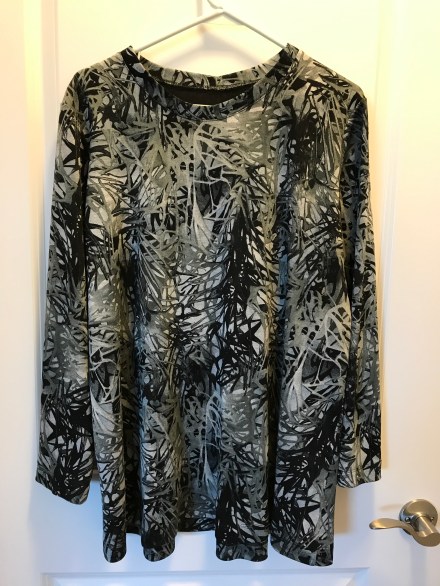 PS – I bought three more lengths of this poly/viscose fabric (different prints) today ( a half-price sale). Just finished cutting them out. Intending to replace the solid tunic tops I made last year with a fabric that pills like crazy – it needs to be shaved after every wearing. This fabric didn’t pill when I wore the tunic yesterday.
