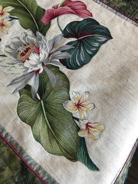 The question is why bother? Why didn’t I just fussy cut the flowers, fuse and edge-stitch them in place and leave it at that? Good question. The thread painting, in spite of the large amount of work involved, adds interesting texture and dimension to the fabric turning it into a piece of wall art. I probably should have thought more about the size of the piece before I began, choosing fewer elements, but this panel does make an interesting art object. So I committed myself to the work. In addition, the fabric raw edges are inclined to fray because the bark cloth is loosely woven – thread painting lets me densely edge stitch creating a sharper outline for the flowers and leaves.