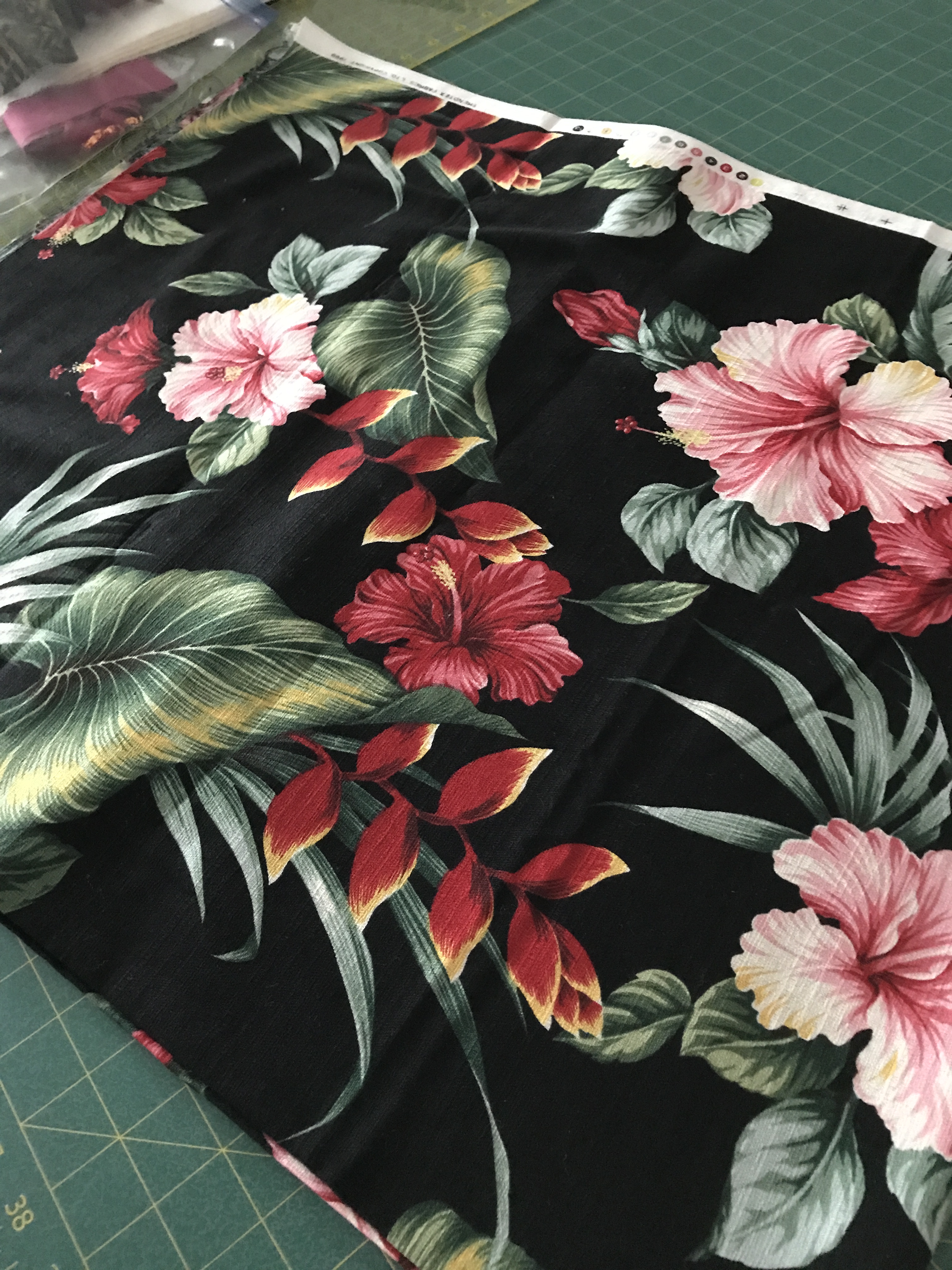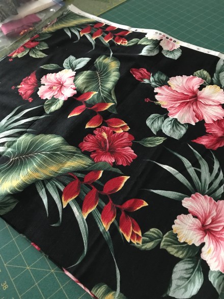 I started with printed bark cloth given me by a friend – 4 one metre pieces with different coloured backgrounds. I chose the blue to work with here but you can see from the black piece just how clearly printed the flowers are. The fabric provides a lovely foundation for doing thread painting.
