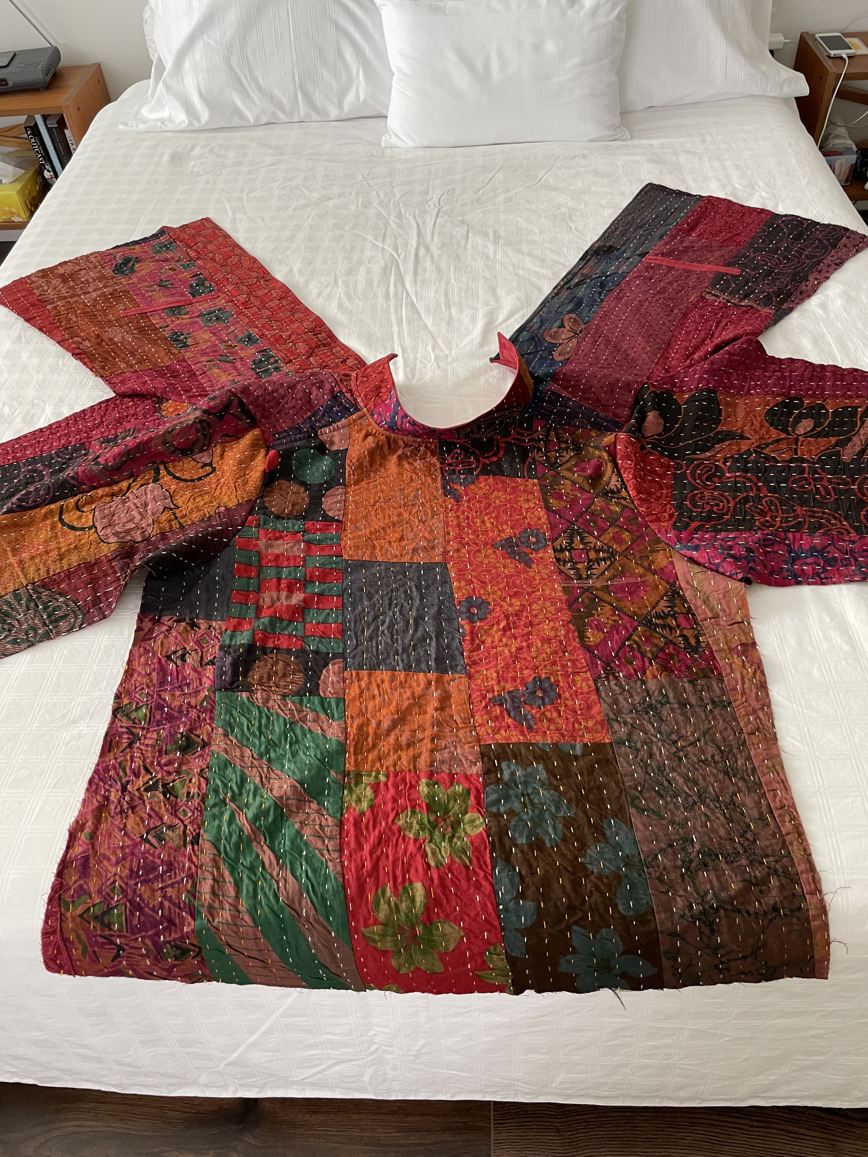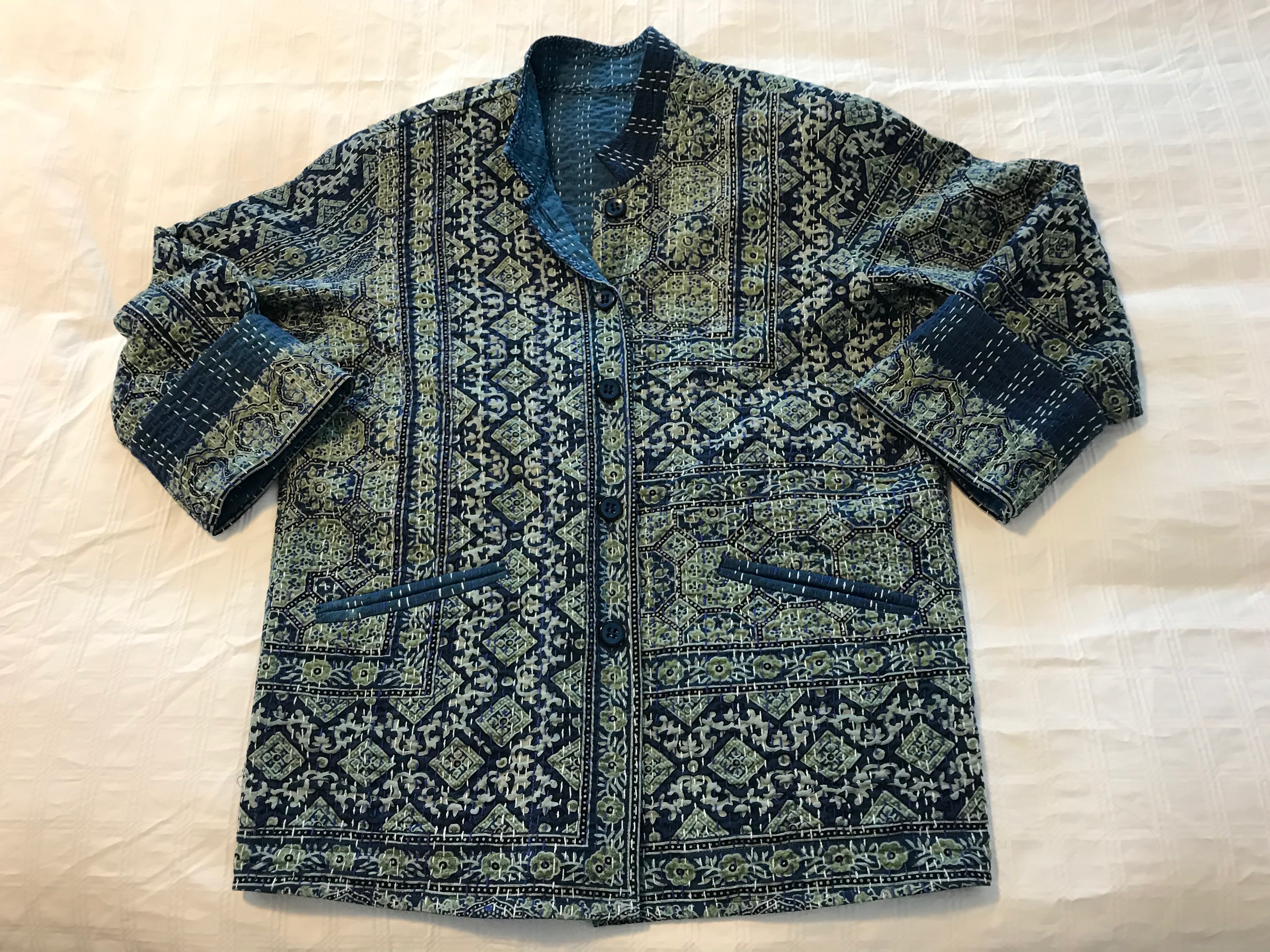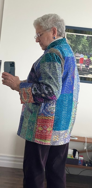 I started this jacket when I thought jacket #2 was a flop and hadn’t yet worn it. I bought this silk patchwork kantha bedspread on Amazon intending to toss the second one and make another from the bedspread.