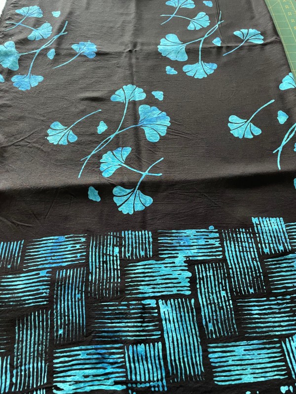 You can’t see the seams but every seam has been bound using a dark blue batik fabric. I used that fabric for the front facings. I also used a rather heavy weight interfacing on the front edge just slightly narrower than the facing so it doesn’t show but it gives a firm body to the front edge.