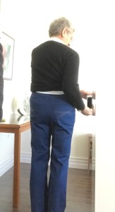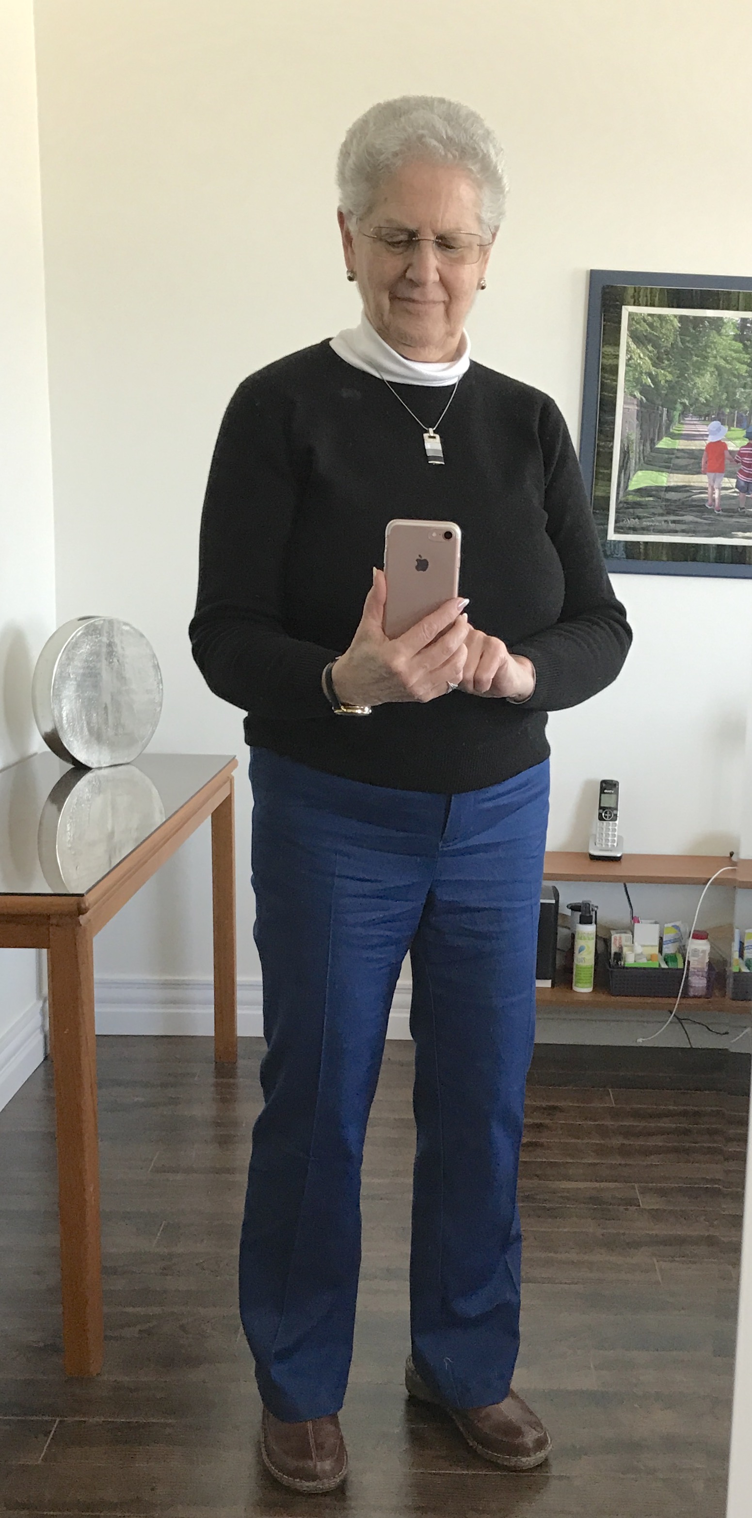 There’s a jeans back yoke to shape the top hip area which works quite well. There is still some bagginess just below the bum which I suspect I could get rid of if I brought in the back crotch about an inch – I’m not going to do that on these pants. The fullness doesn’t show when I wear a tunic length top. However, I will try that with the next pair – a dark maroon to go with the Ebony T-shirt.