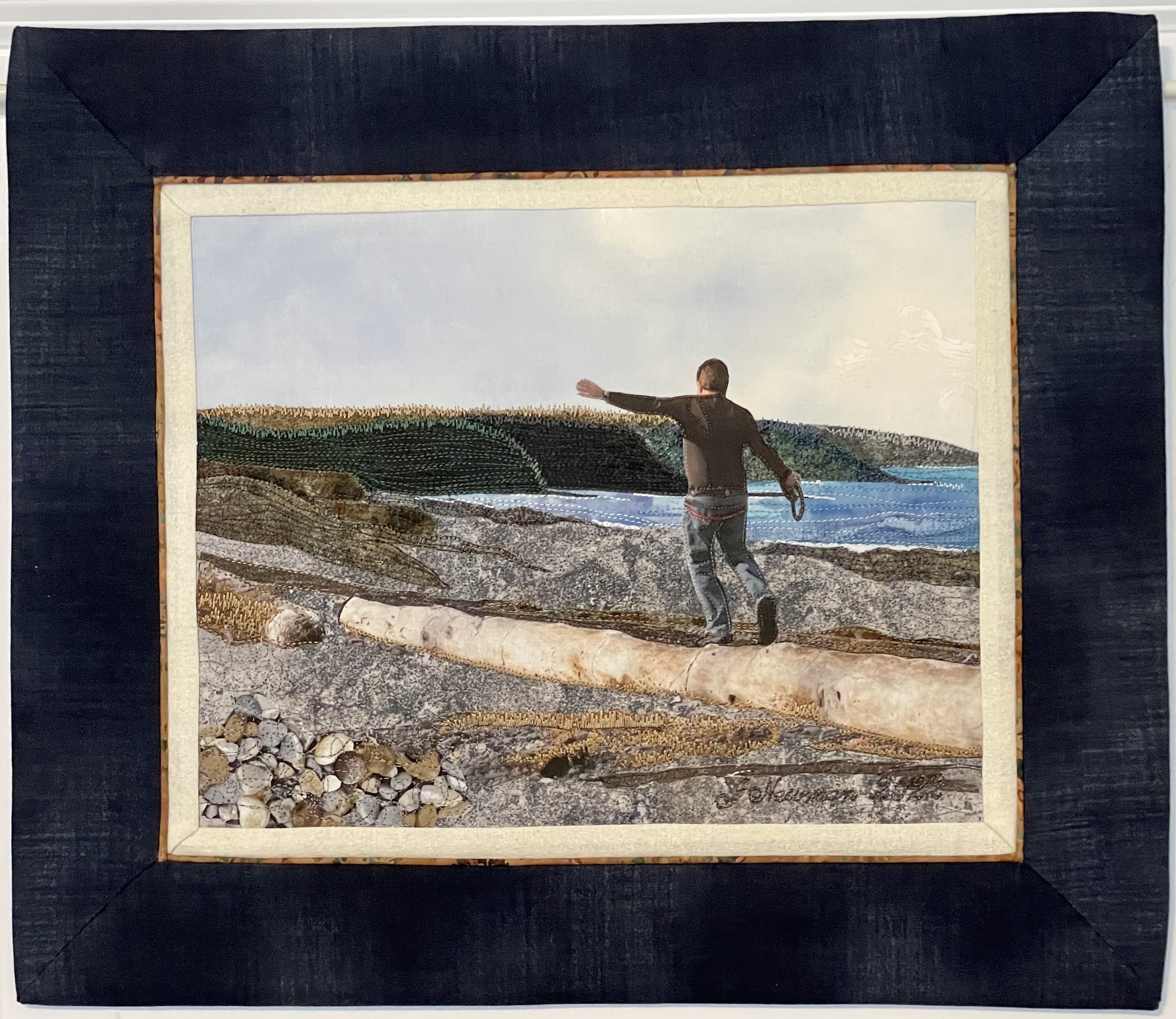 The colours in the piping bring out the blues and golds from the image and the very dark navy frame lightens it. From a distance, the log glows because it’s sun bleached.
