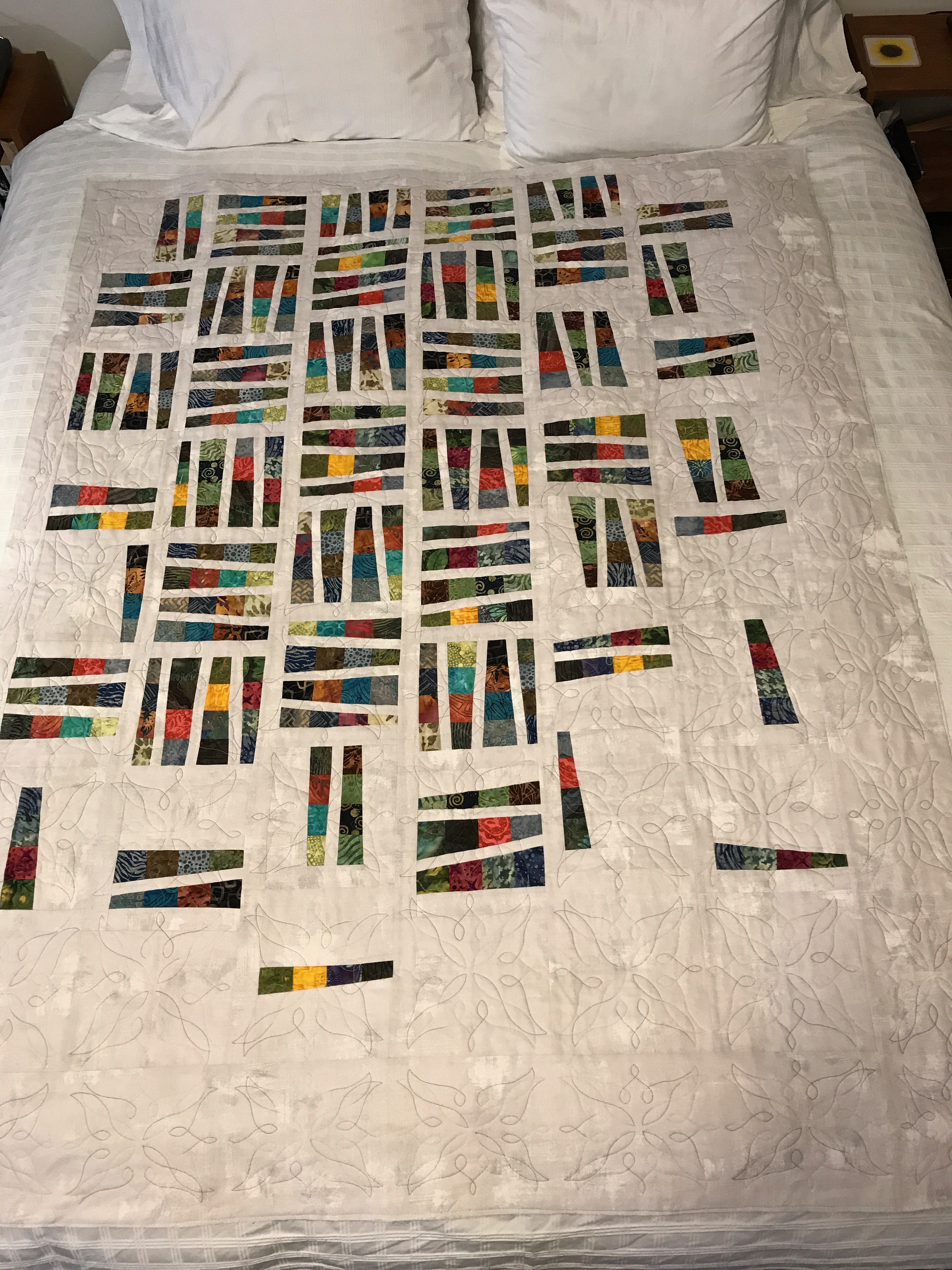 Finished this quilt this afternoon. I’ve been working steadily on it since early last week. First doing all the edge stitching on the appliqué (154 fused elements), adding the borders, setting up the quilt, then quilting the “blocks”.