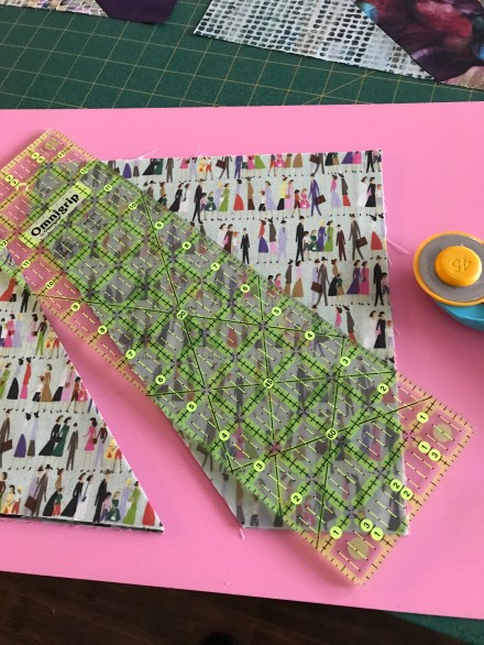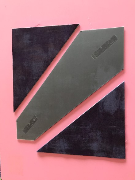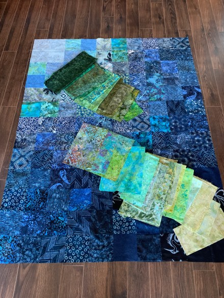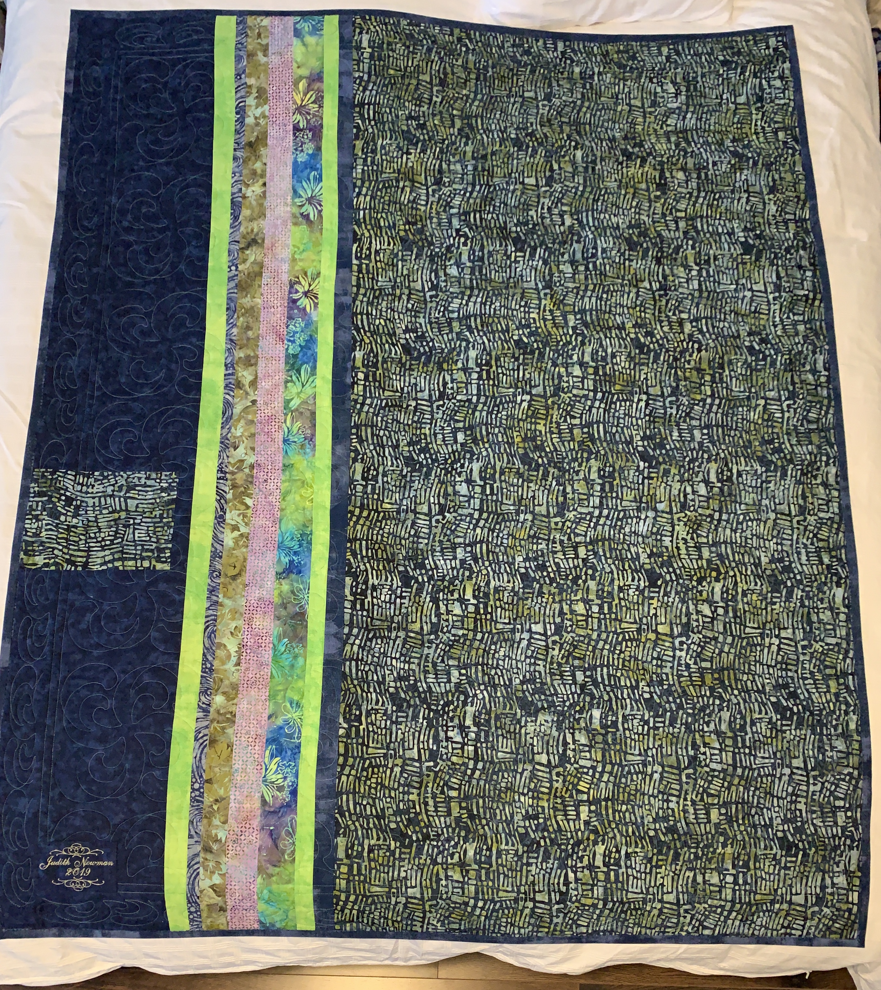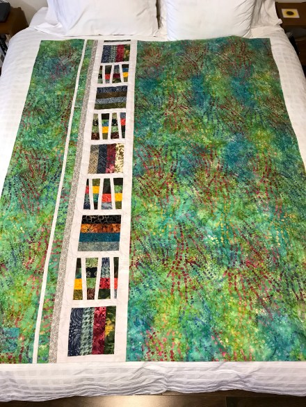 Here’s the pieced back – I didn’t have quite enough of the dark blue fabric so added in a block of the main fabric, along with the longitudinal stripes.