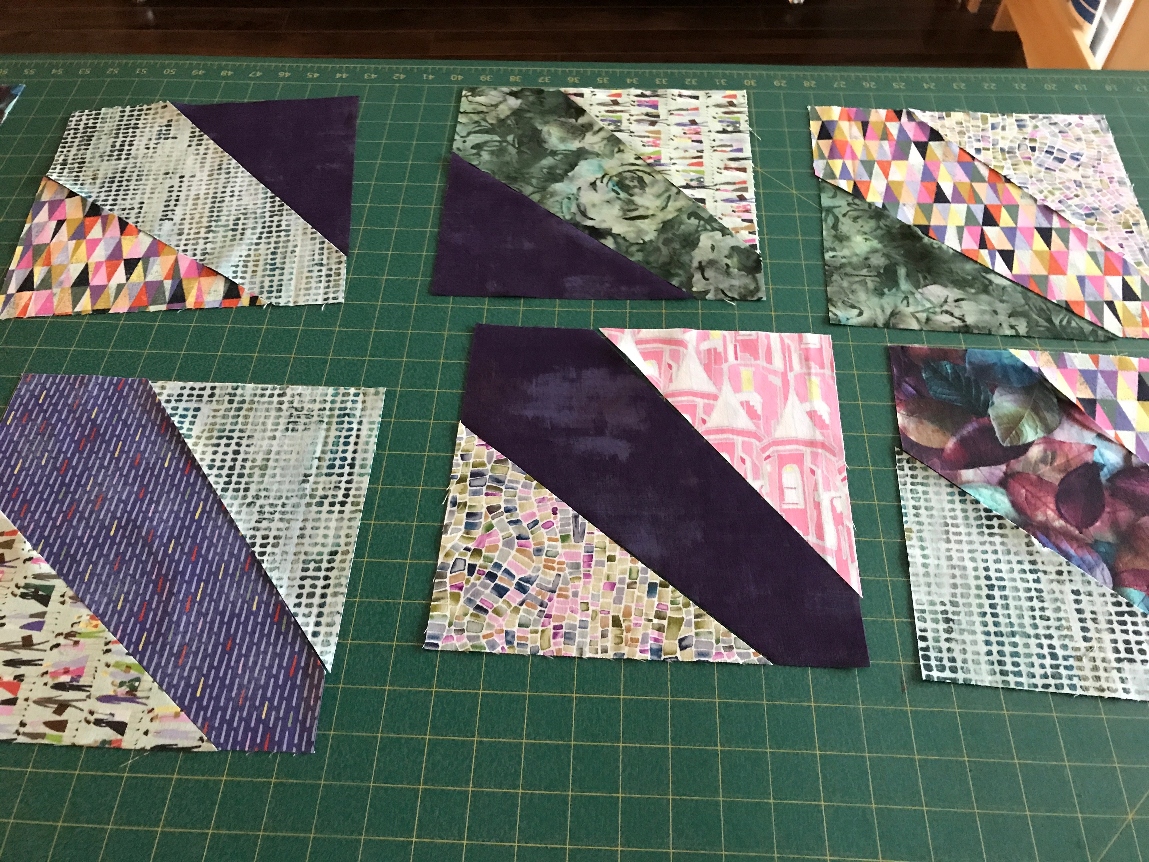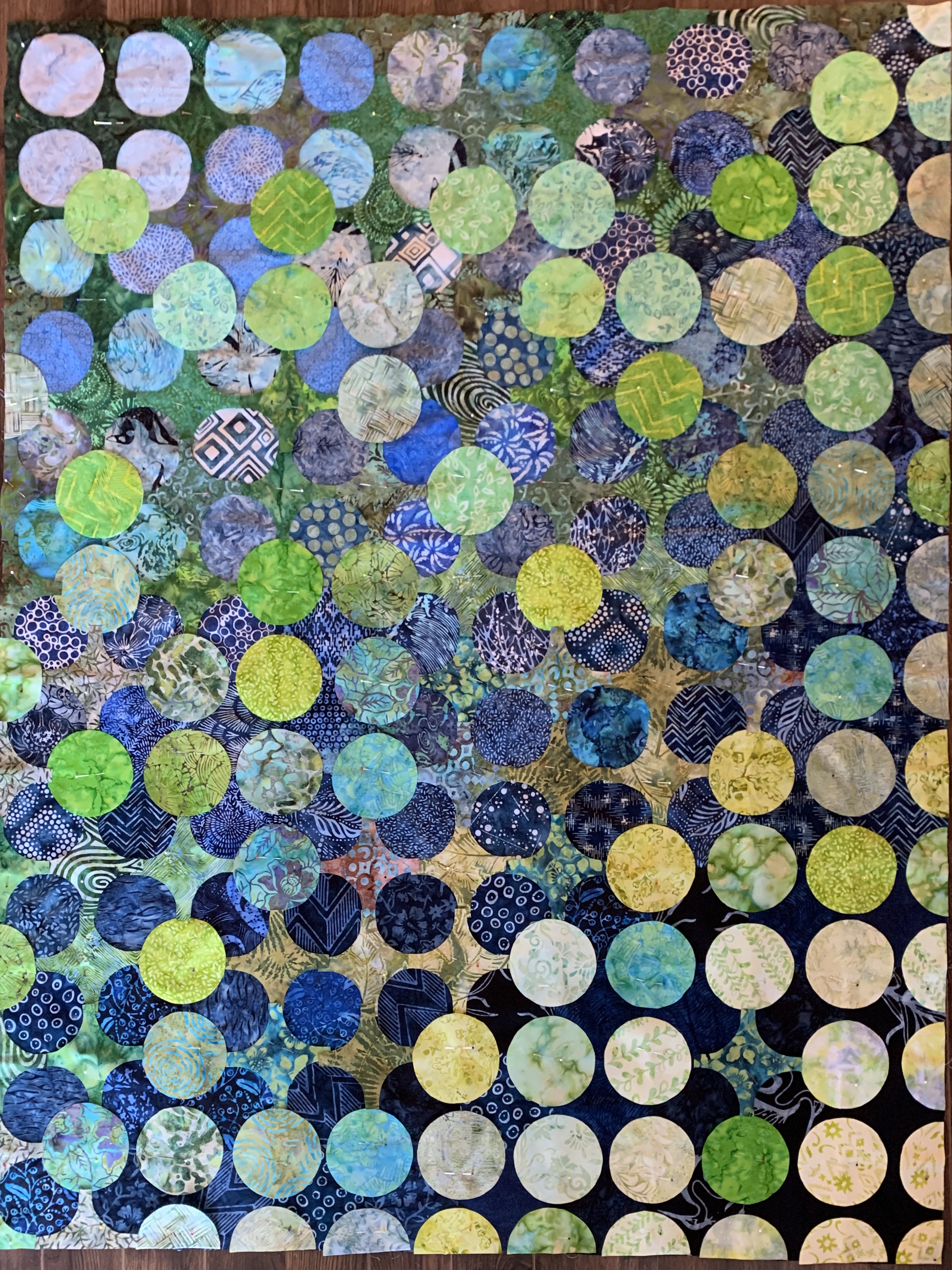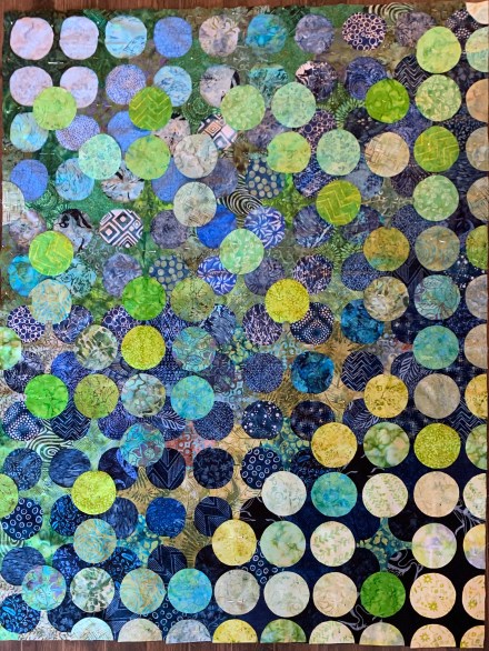 You can sort of see the quilt block as it sits over 4 of the underlayer blocks – it’s a curved pinwheel which was large enough to overlap the appliqué circles and follow the curves of the “x” pieces.