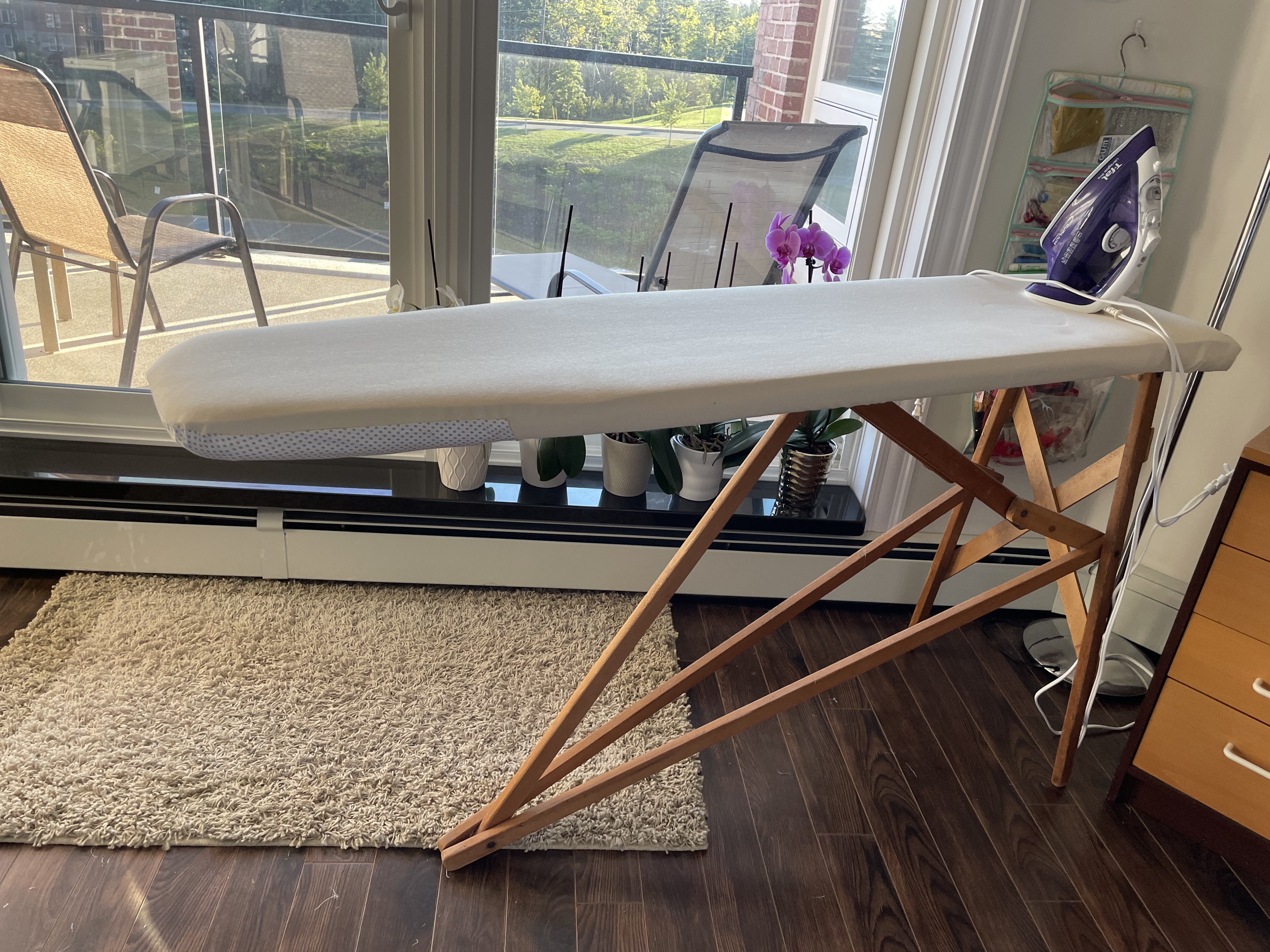 I’ve tried metal ironing boards but they don’t compare with my antique. This board is a comfortable height, slightly wider, and close to a foot longer than a standard metal ironing board. Now that my board has a fresh twill cover with the wool pressing mat beneath I’m in business for at least another five years.