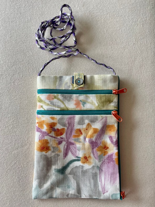 I’ve been wanting to make a small carrying bag for my iPhone. I find the version of the phone (XR) I have now is just a bit too large to carry comfortably in a pants pocket. So I’ve taken to using an embroidered glasses case (that has a side pocket with a zipper in it). I was given my first one by a friend. I added a cord to the open end and turned it into an iPhone case.