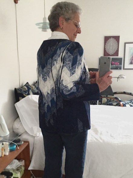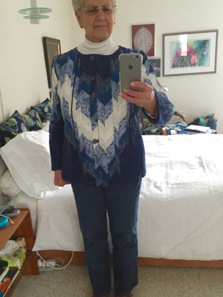 A simple pattern with just two fronts, a back and sleeves which went together easily and because it’s boiled wool I didn’t need to finish edges! In fact there’s a dart at the bottom of the sleeve which is stitched by abutting the two edges and zigzagging it closed – doesn’t show but gives shape to the lower sleeve. I’m still debating whether to do something similar in the middle of the back at the neckline – I’ve a slight rounding of my back at the neck and I think the jacket would fall better in the back were I to make that tweak.