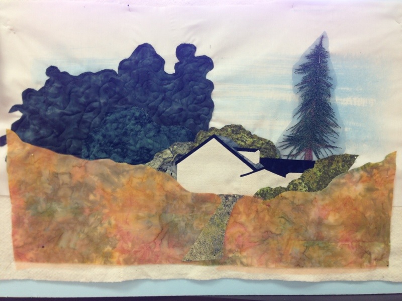 Have I ever learned a lot about how to think about an art quilt piece. Some aspects of this quilt were done out of order – in part because Laurie was moving us along so we’d have the batting covered by the end of the workshop. I now realize the sky should have been tied down first – that would have avoided the big bubble in the sky fabric. The “woods” on the left were out of synch – the dark underlay should have been much less extensive so that the tree elements could have been positioned against the sky with sky showing through the trees. Also that would have allowed a more irregular skyline. The asparagus field in the foreground should not have been added until everything behind it was almost complete – I had to fight the free motion stitch work because the asparagus was already present.