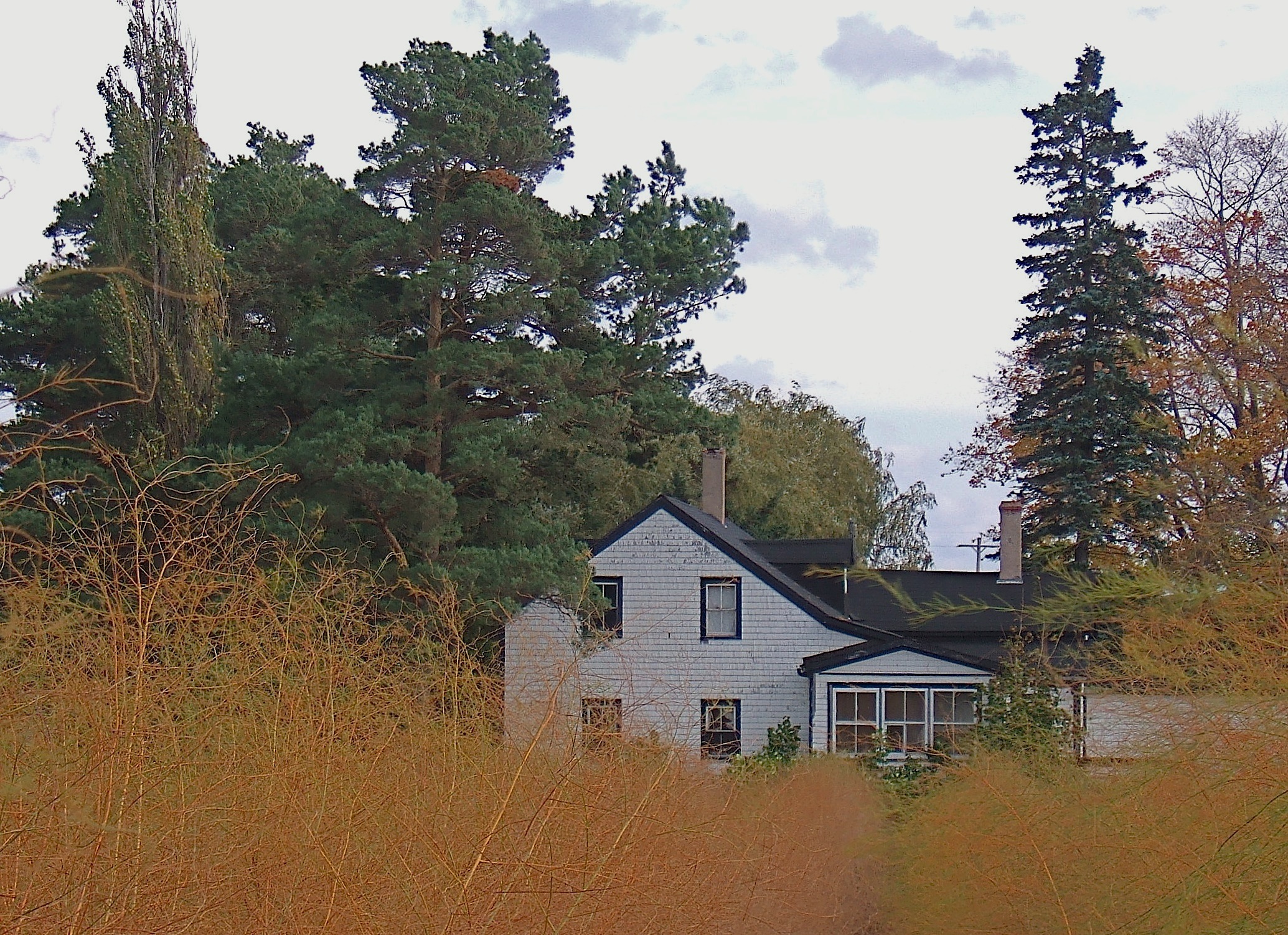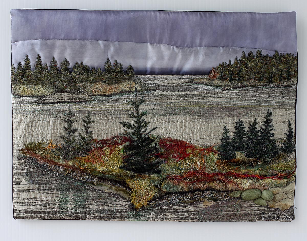 The detail stitch work is done. Today I worked on the asparagus field; it turned out to be easier to do than I thought it would be – I think the practice I did yesterday definitely helped. I also picked out the stitching for the small shrub beside the front door, and replaced it with something more recognizable as a small evergreen tree. I also added a few small evergreens just behind the house to provide a bit more Interest to the skyline.