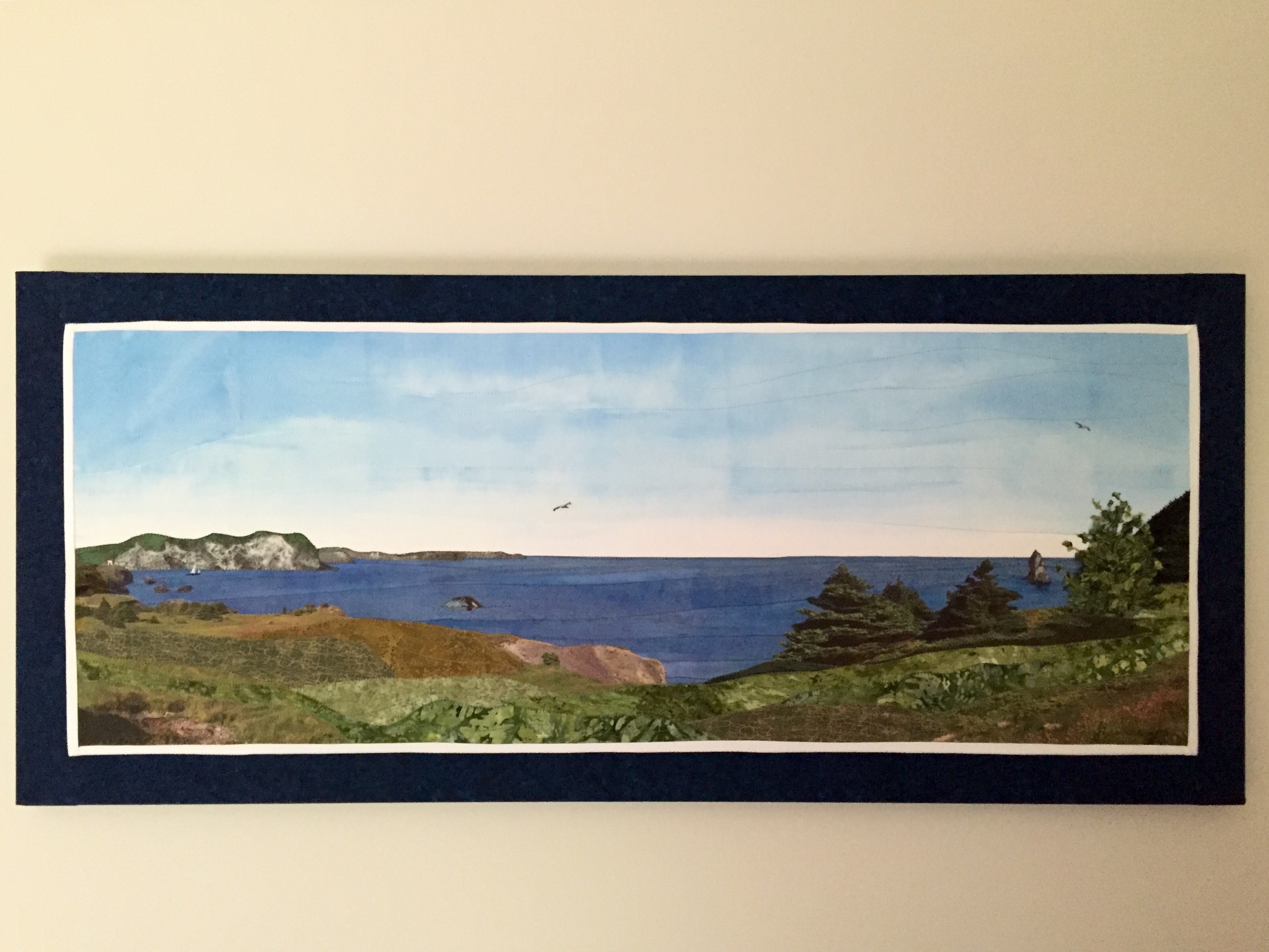 I woke this morning thinking about a new art quilt – initially I thought I’d do one of Trinity NL showing the village, but the photos I took weren’t interesting enough to warrant the amount of work an art piece like this involves. Stupid me, I didn’t even think of taking a panorama photo of the ocean side of the lighthouse ridge although, fortunately I had three photos that overlapped (or nearly did) at the location where we stopped to watch humpback whales leisurely feeding.