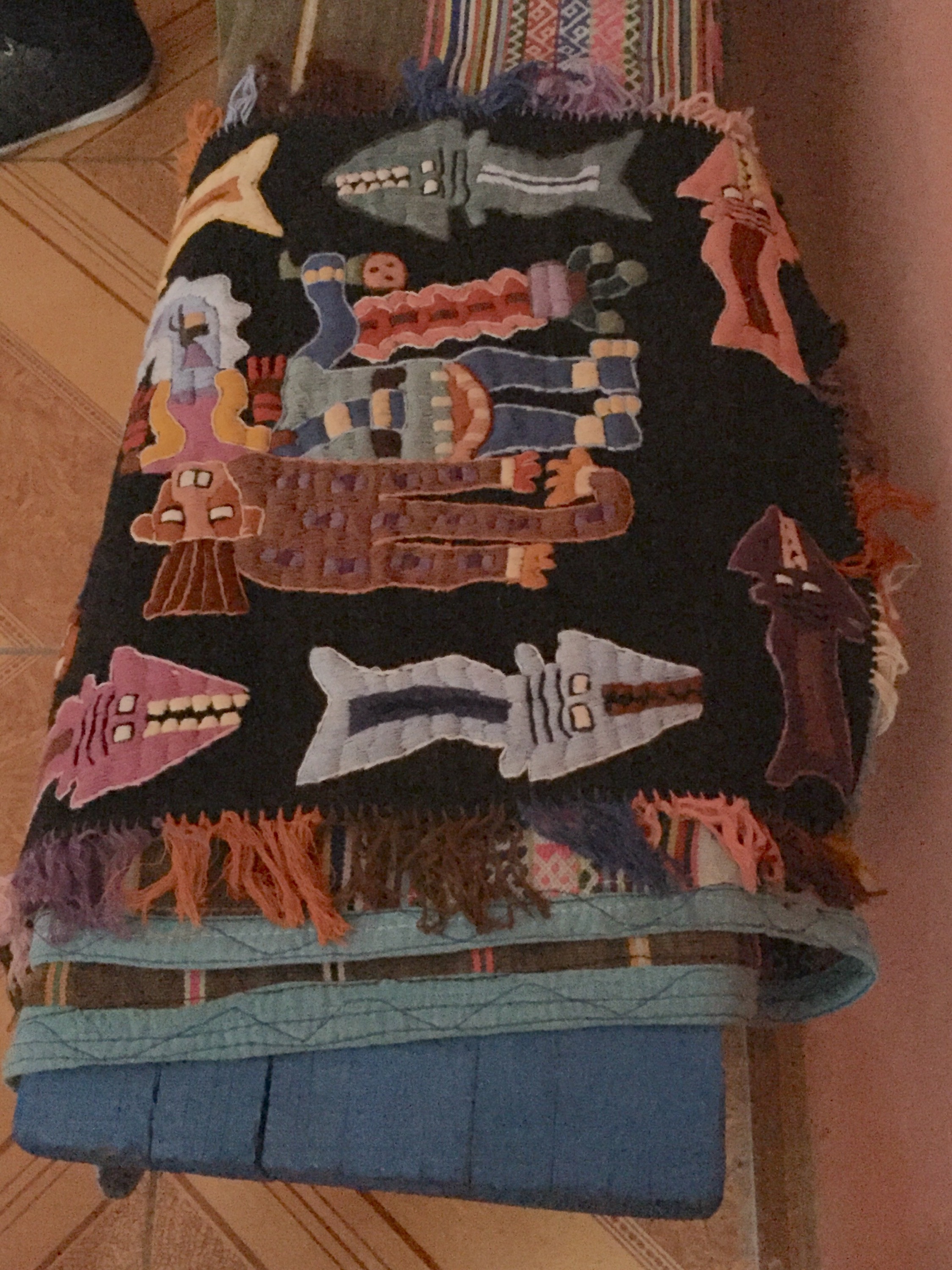 In spite of the TD, I really enjoyed Peru – a completely different way of life, even in the urban settings. I loved visiting the artisans and seeing how their work is one constant improvisation on traditional crafts – either in terms of technique, or subject matter, or both. I know what I saw will affect my own future creations.