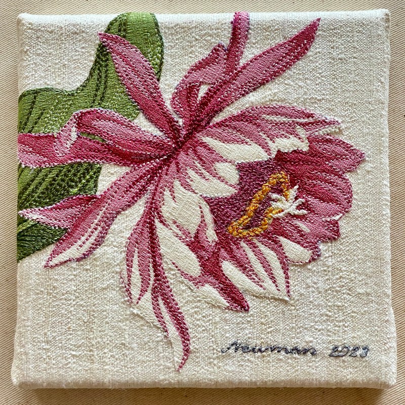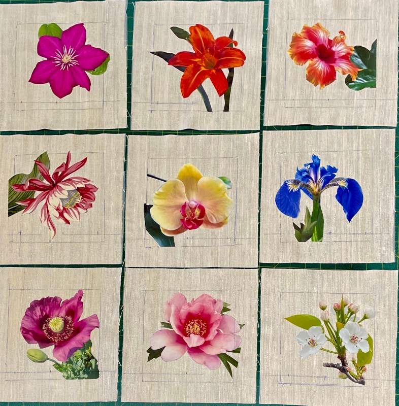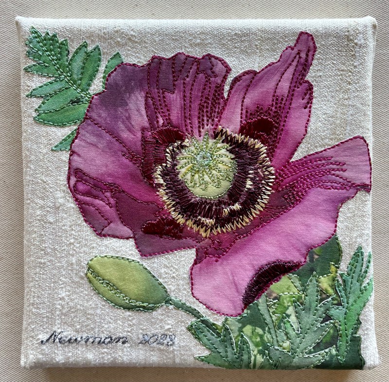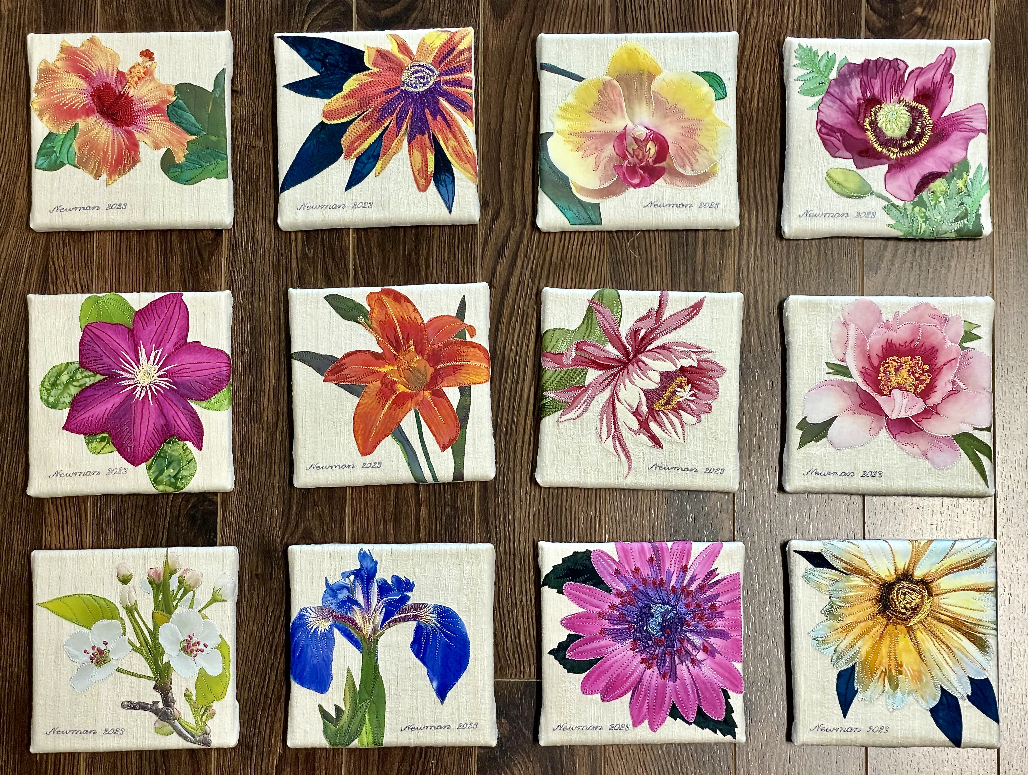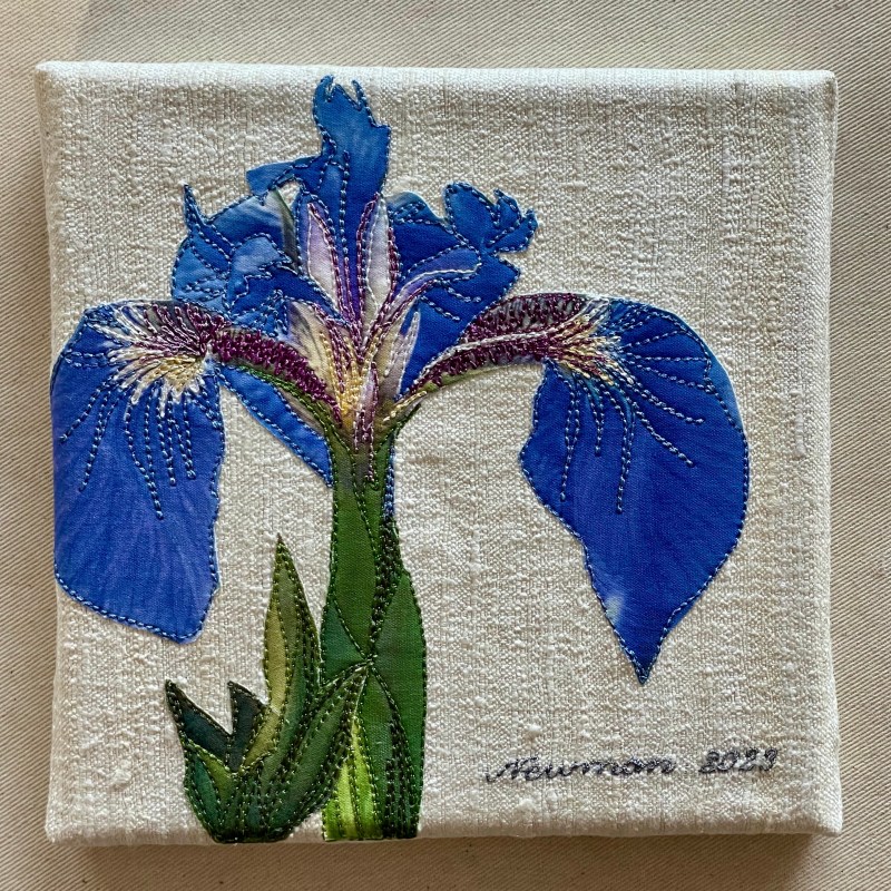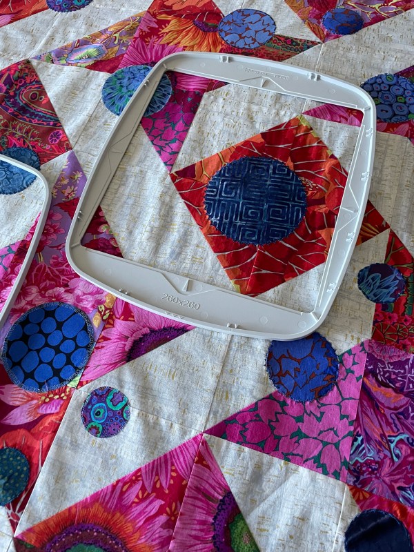 The quilting took just three days – that’s because I elected to quilt the top in 4-block squares. That meant each row had to have a half design (because the top was constructed with 9 columns). I decided to stagger the quilting blocks so the half block elements alternated from one side to the other – half using the right side of the design, the other half using the left. Nobody but me will ever notice. All anyone looking at the quilt will see is the fact that it is quilted! I chose thread to match the background fabric on top; the bottom thread matches the blue/grey background fabric – same weight Wonderfil variegated, just a different colour. I embroidered the standard label I always use in a dark navy blue – I usually mute it to blend in but decided this time to make it stand out!
