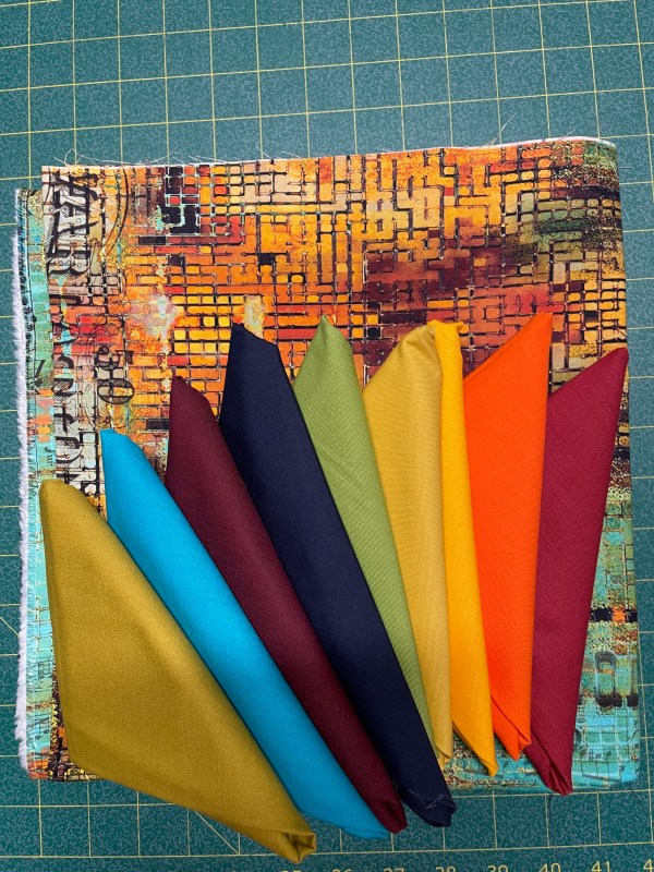 The print is Eclectic Elements – Abandoned (Rusted Patina) by Tim Holtz for Free Spirit. What grabbed me about the fabric was the rich colour pallet in yellow/oranges and turquoise/greens. When I pulled the solid fat quarters from a nearby box (conveniently at hand on the table in the shop) and laid them on the print the whole came alive. I figure there has to be a way to use the solids so they create a background and the print becomes the dominant feature (rather than the other way around – which is what I fear may happen)! My idea is this: start by cutting 4 1/2″ strips from the print, then cut 2 1/2″ strips from the matching solids, sew them together in pairs, then create a tube from the print strip and the two solids strips, from which I can then cut half-square triangles! I may want to subdivide the solids even further before I pair them with the print – to break up the concentration of solid colour….