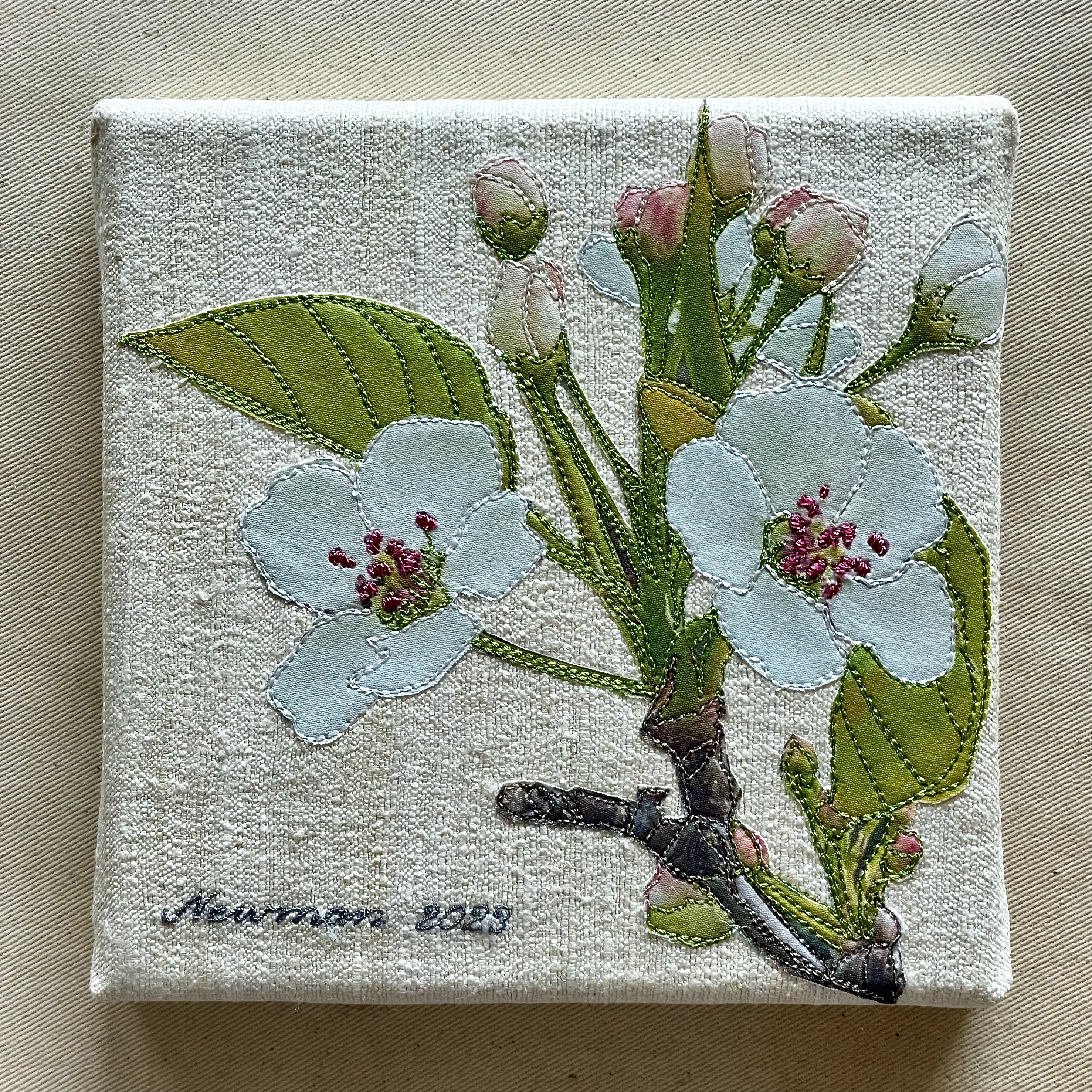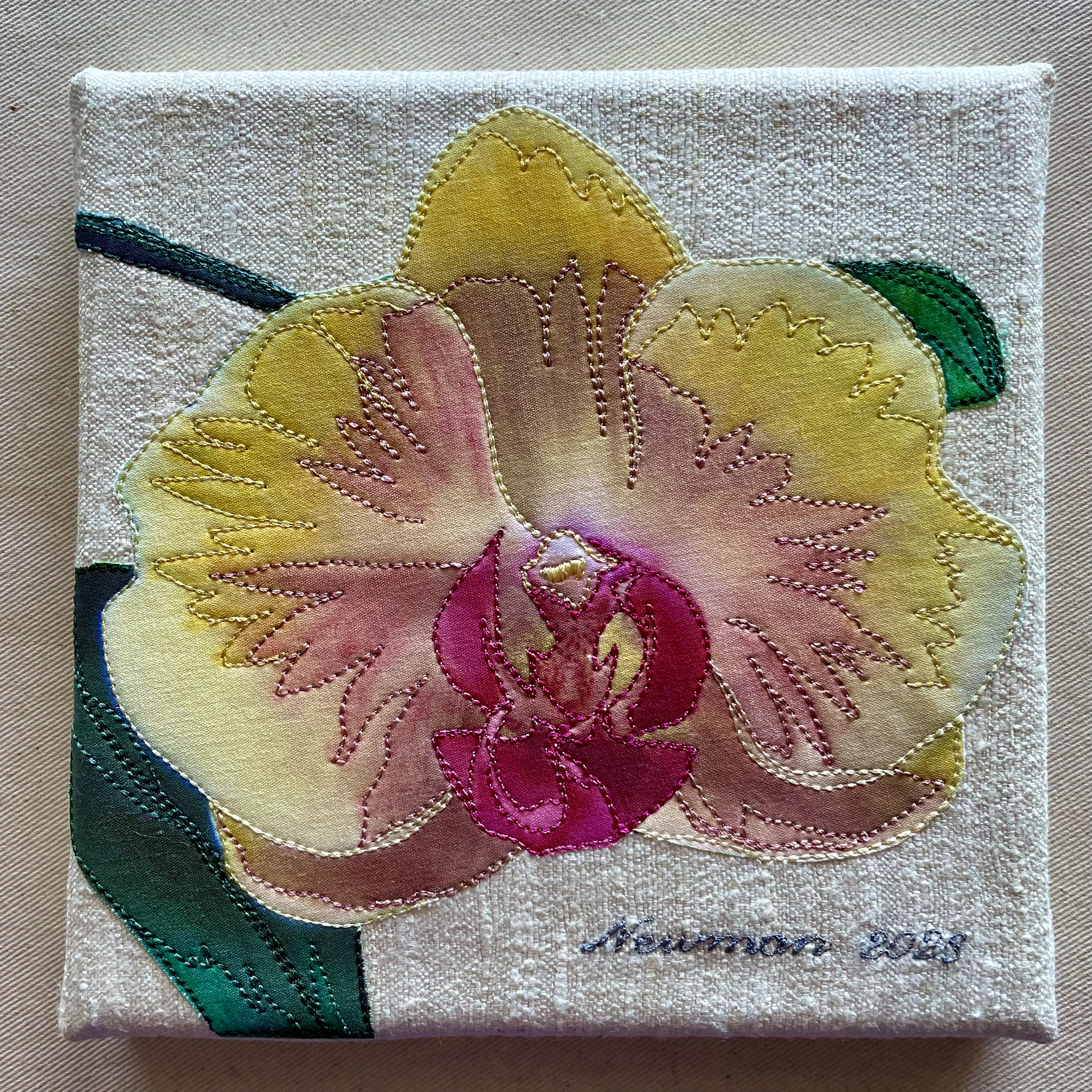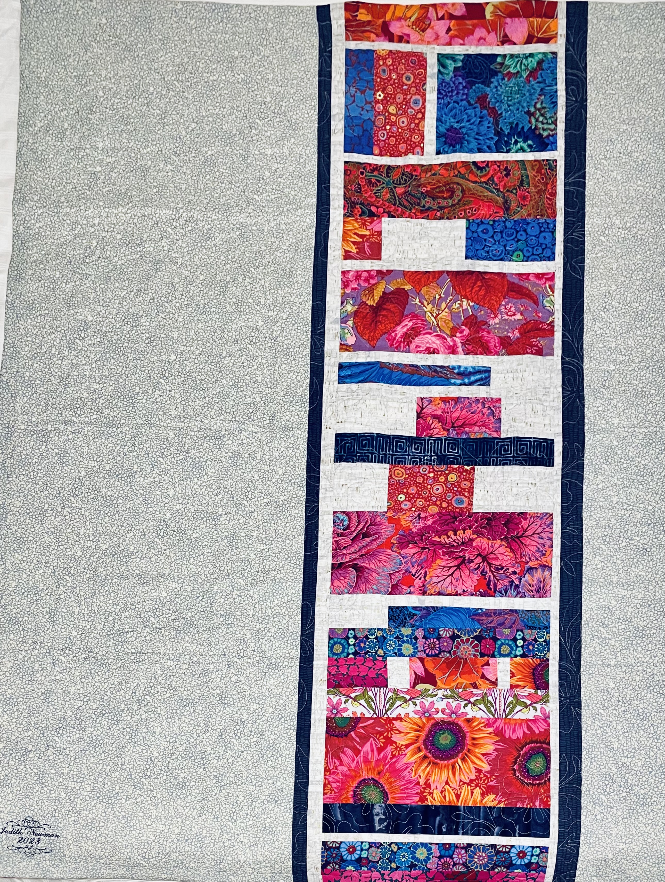 The quilting took just three days – that’s because I elected to quilt the top in 4-block squares. That meant each row had to have a half design (because the top was constructed with 9 columns). I decided to stagger the quilting blocks so the half block elements alternated from one side to the other – half using the right side of the design, the other half using the left. Nobody but me will ever notice. All anyone looking at the quilt will see is the fact that it is quilted! I chose thread to match the background fabric on top; the bottom thread matches the blue/grey background fabric – same weight Wonderfil variegated, just a different colour. I embroidered the standard label I always use in a dark navy blue – I usually mute it to blend in but decided this time to make it stand out!