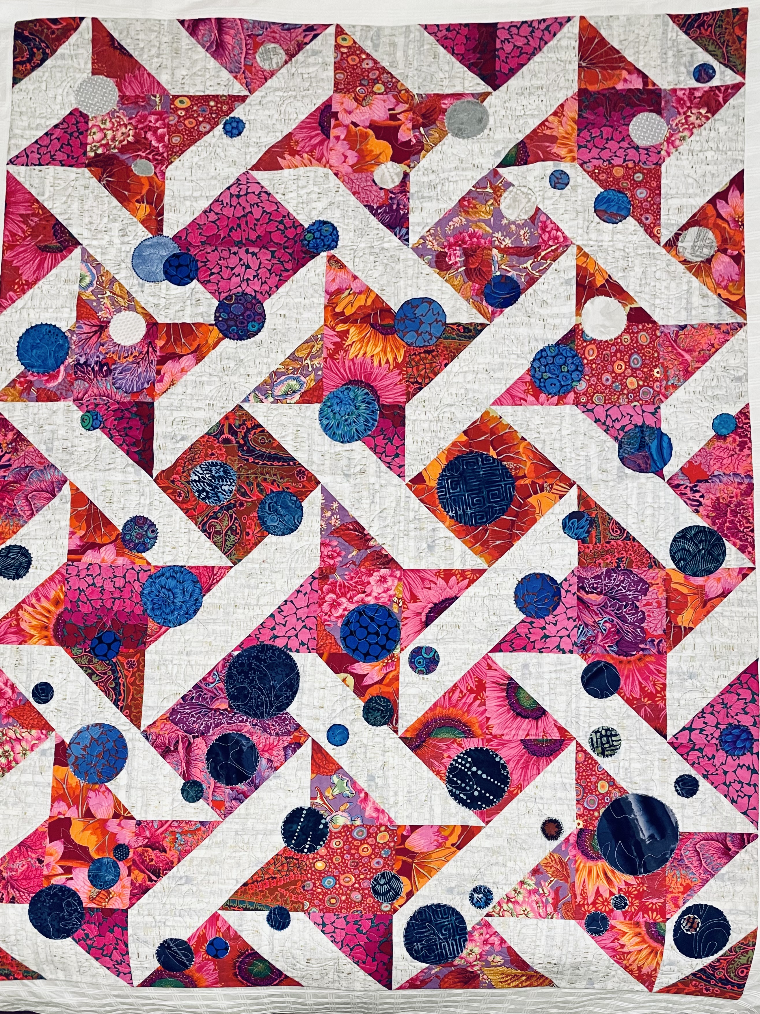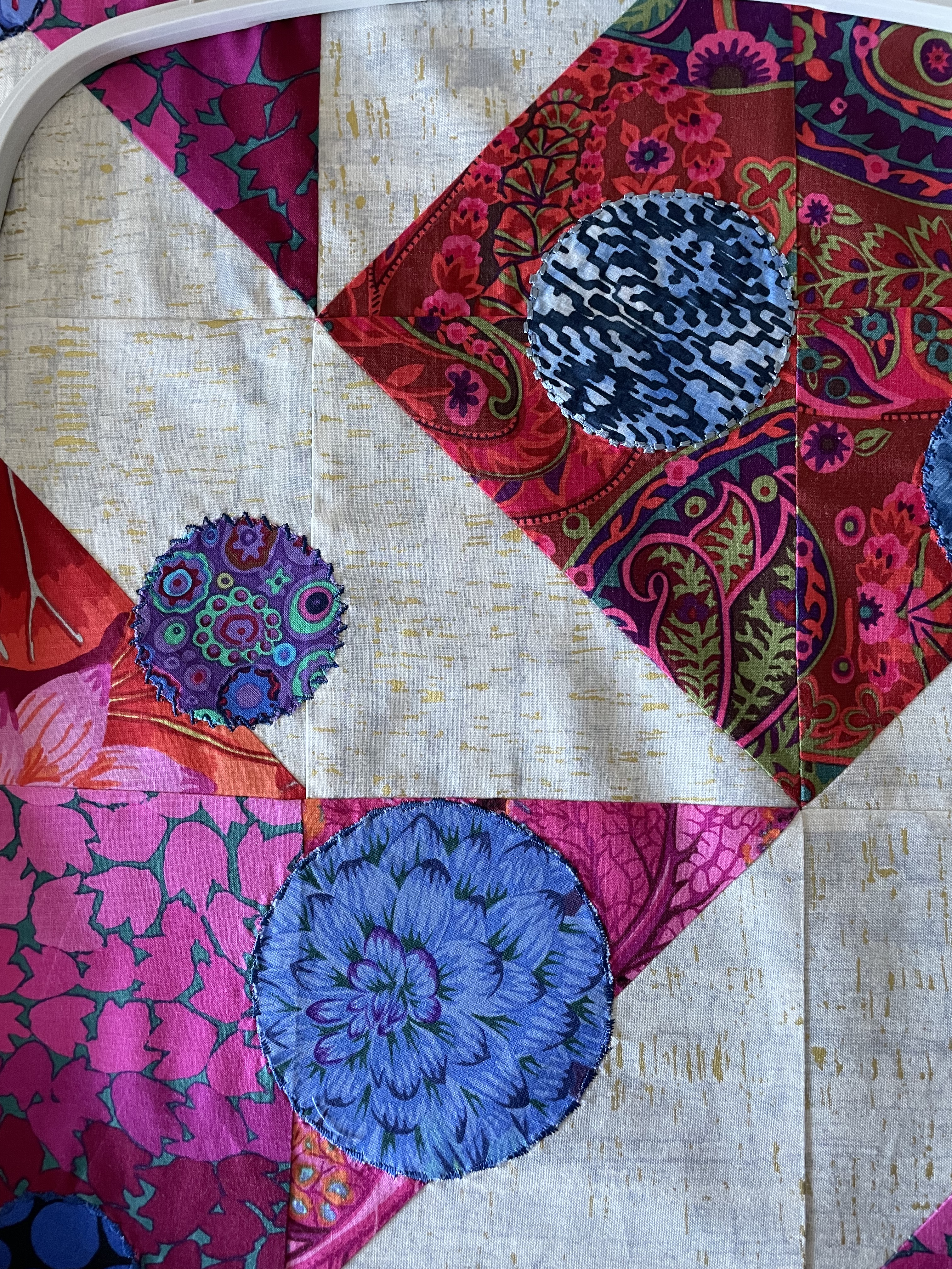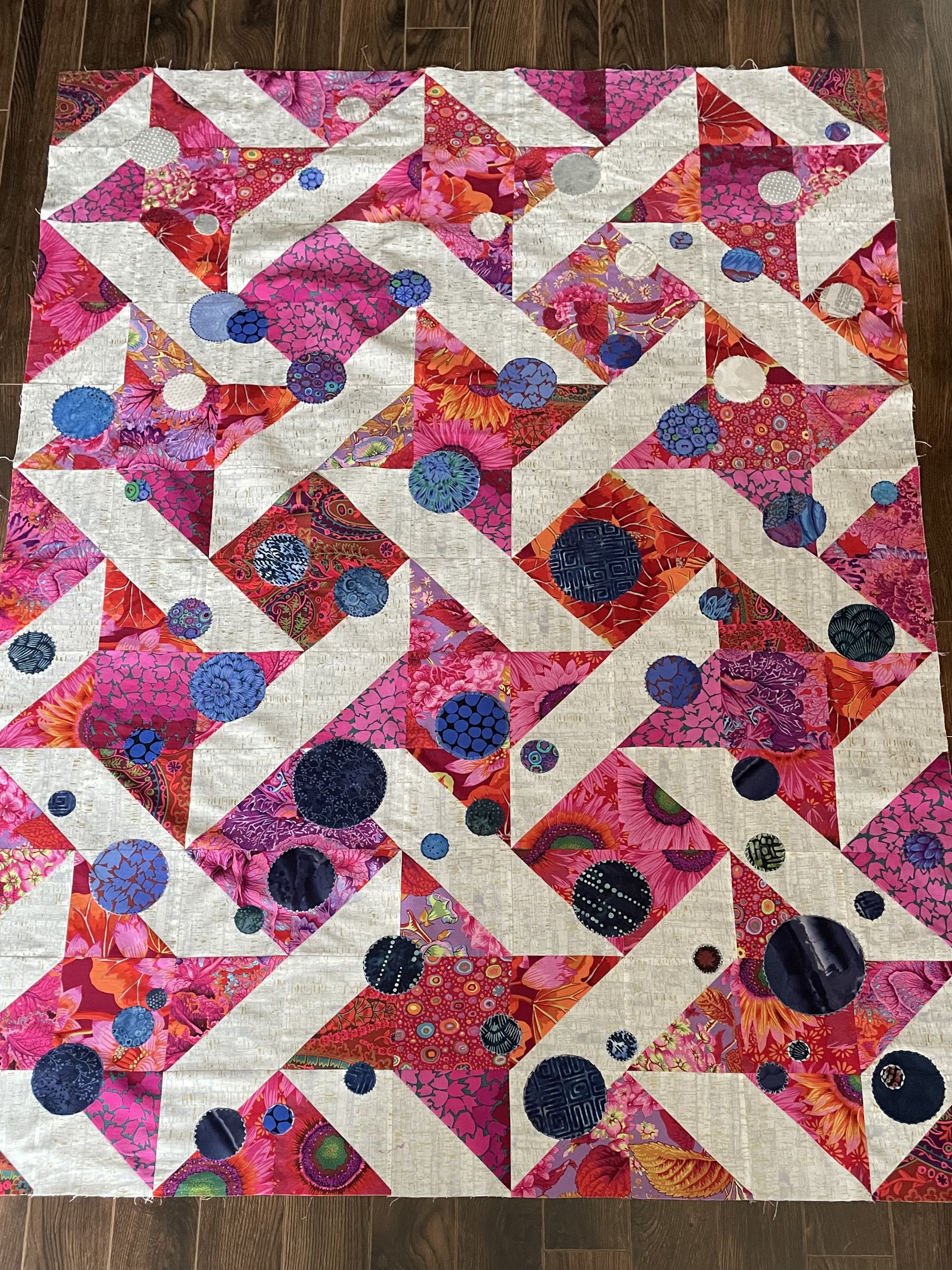 [BTW, no dragonflies, no embroidery – in the end I decided to let the circles be the focus of the work. In the photo you can see the colour and density change from bottom to top of the quilt – which was intentional.] I pieced the quilt back from scraps left over from the quilt top.