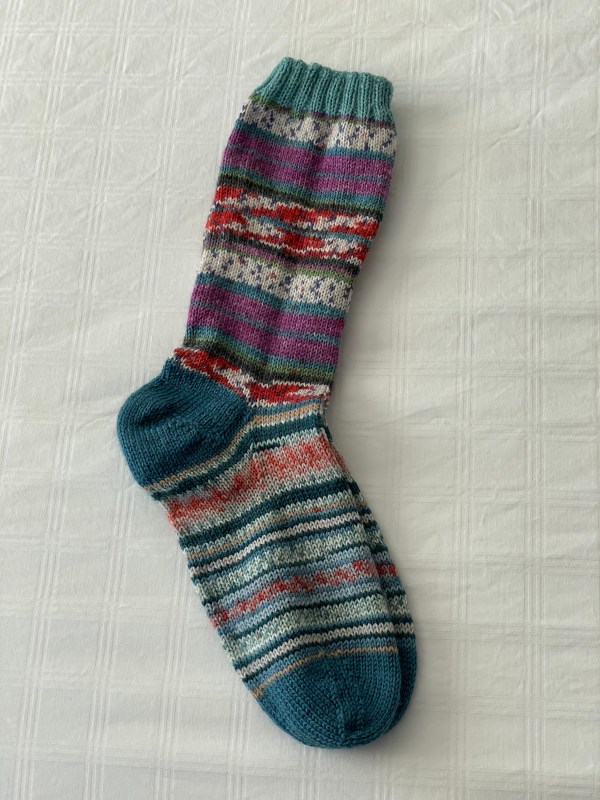 I went to my leftover yarn stash to see whether I still had a ball of the original yarn tucked in there. No luck, didn’t find any. I did find another pattern that looked like it would complement the original pattern. I cut off the feet just at the start of the heel, and reknit new feet.